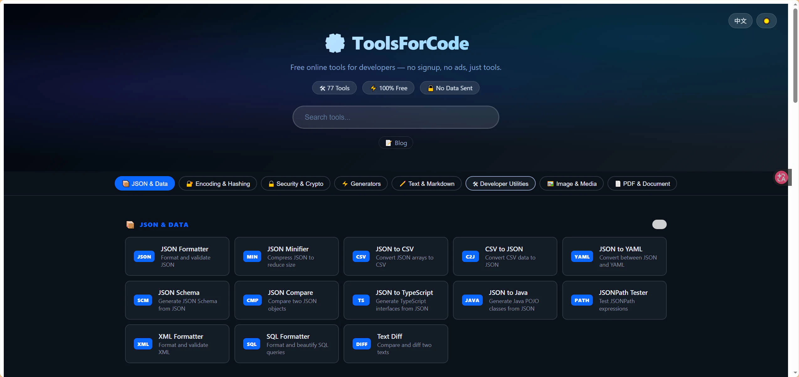 Free online developer tools: JSON formatter, Base64 encoder, regex tester, password generToolsForCode is a collection of 71 free tools built for developers. Everything runs in your browser — no data is ever sent to a server. No signup required. Includes tools for: - MyBatis XML ↔ Java annotation converter - Java code review + unit test generator (AI-powered) Built solo with Nuxt 3 + Vue 3. Deployed on Vercel + Cloudflare CDN.ator and more. No signup required.