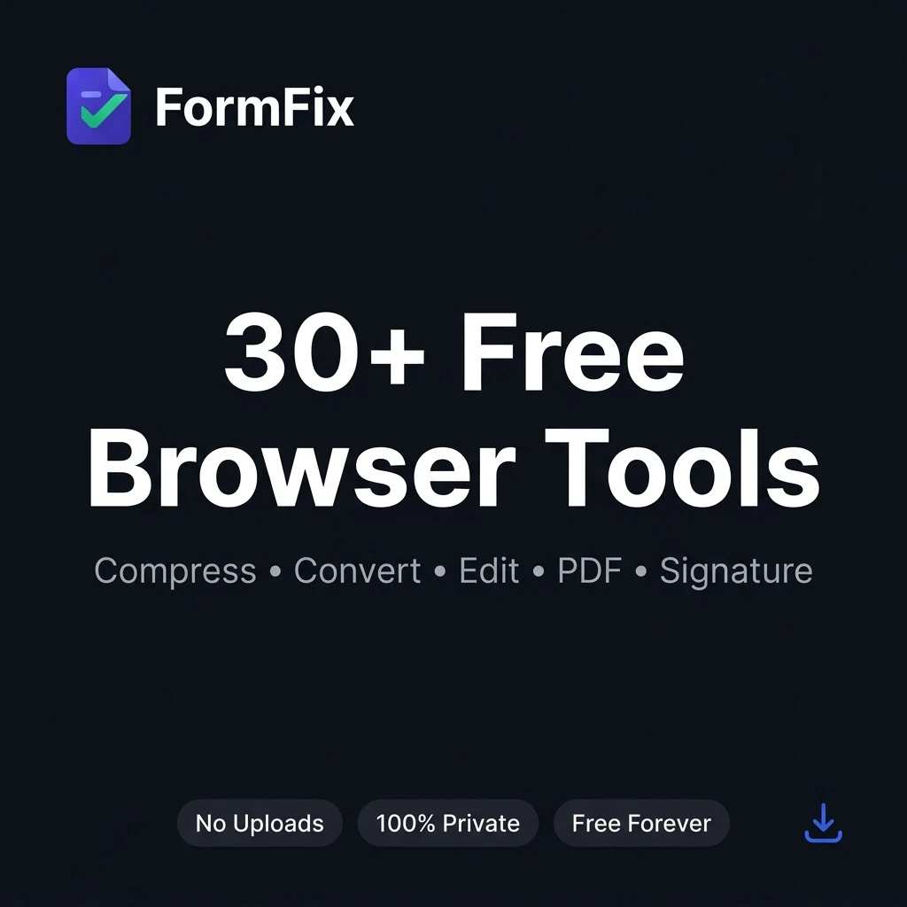 FormFix: Free browser-based image tools. Compress images to exact KB (20KB, 50KB), create passport photos, merge PDFs, make QR codes & more. 100% private — no uploads, no tracking.