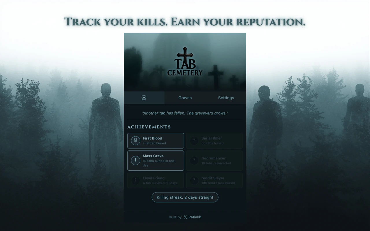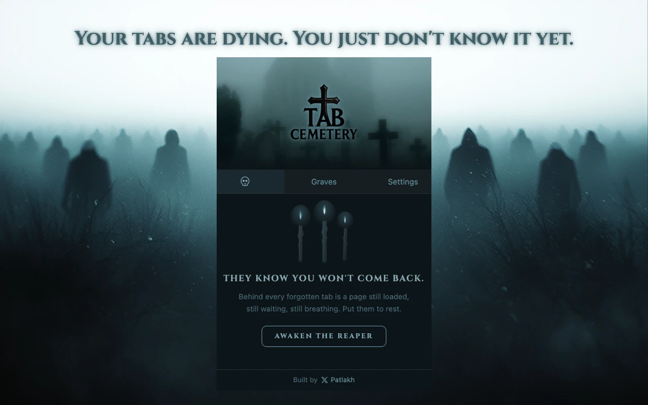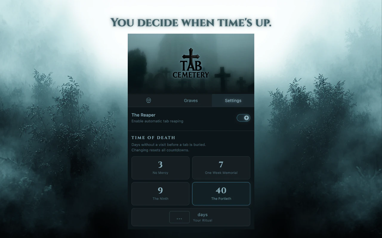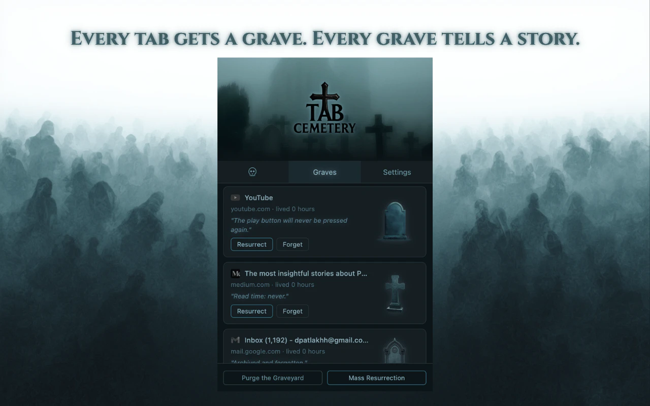 You have 50 tabs open. You're not going back to most of them. You know it. Tab Cemetery knows it too. It auto-closes tabs you haven't touched in days and buries them in a gothic graveyard — complete with 12 hand-drawn tombstones, 150+ site-specific epitaphs, a death bell, achievements, and kill streaks. Resurrect anything with one click. You almost never will. Free. No tracking. No ads.