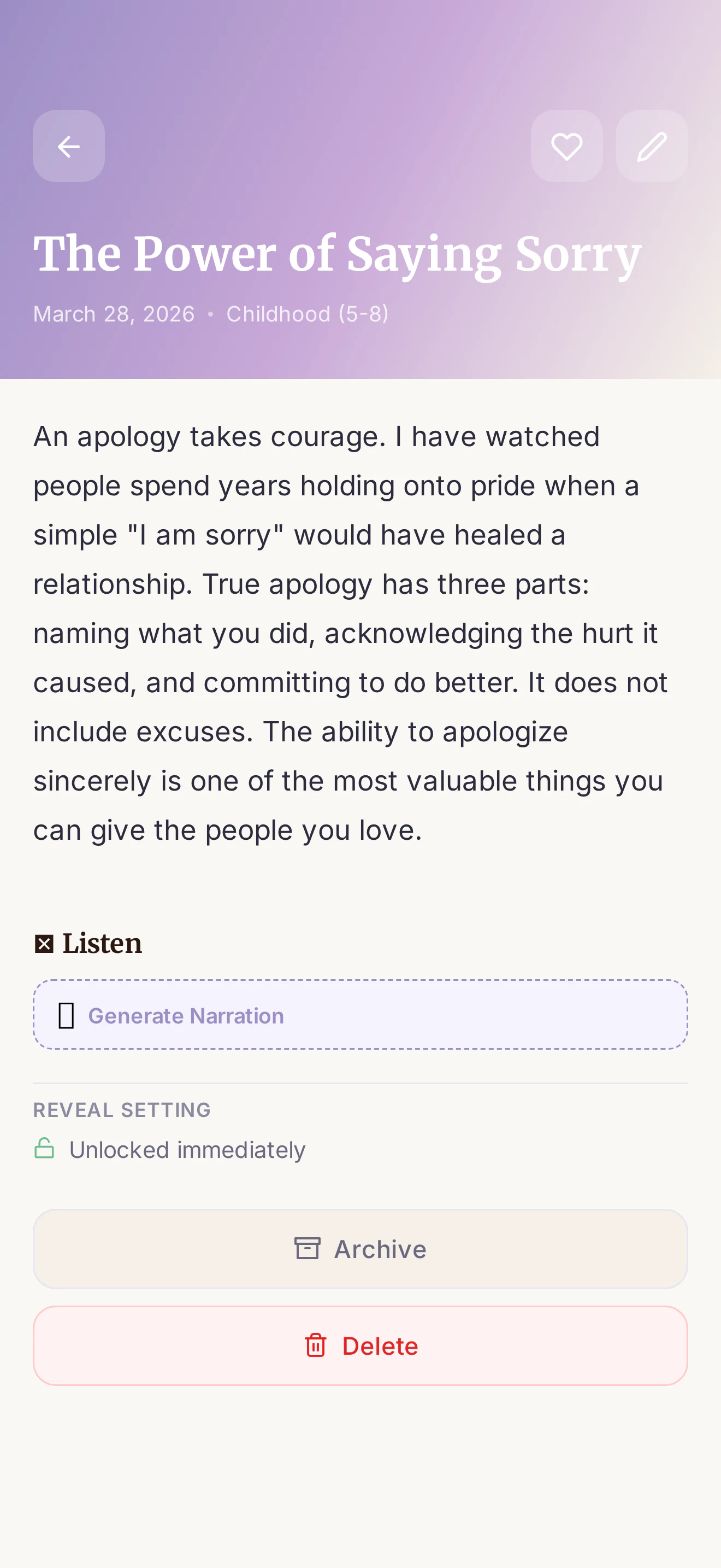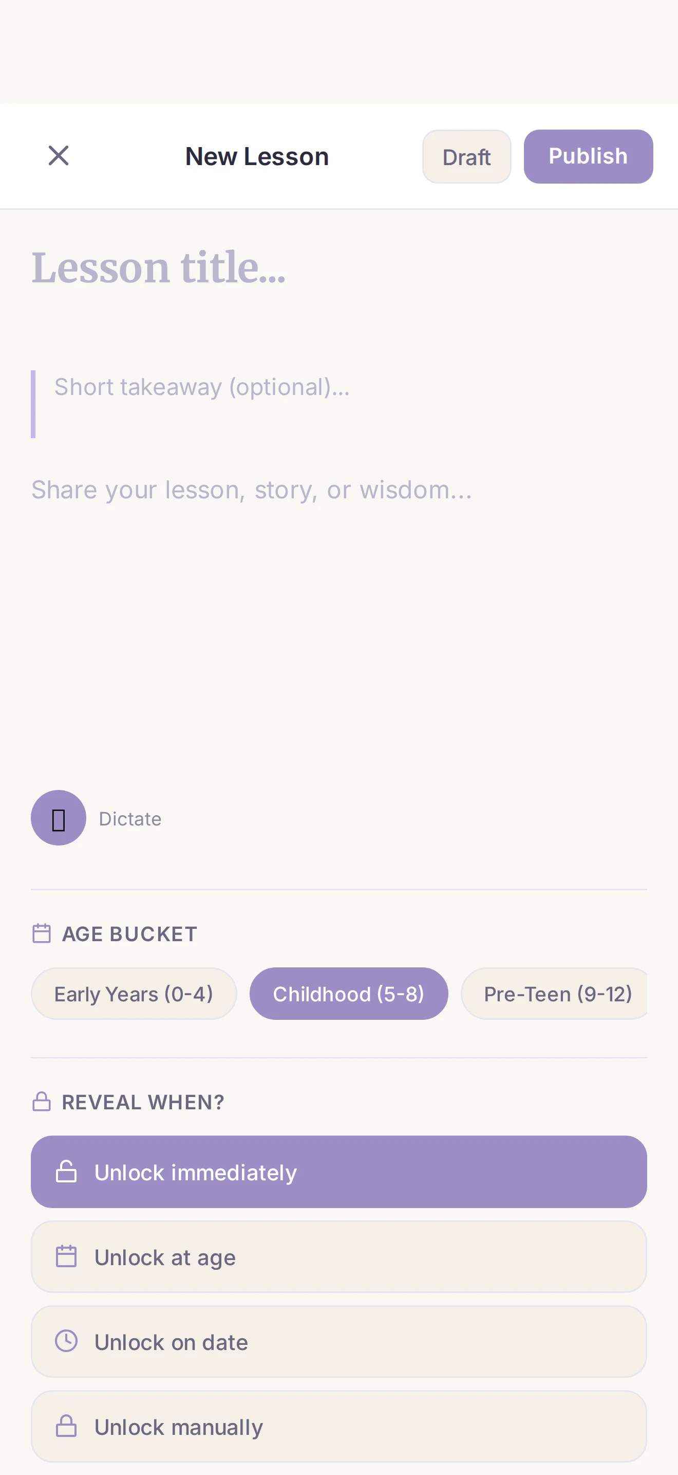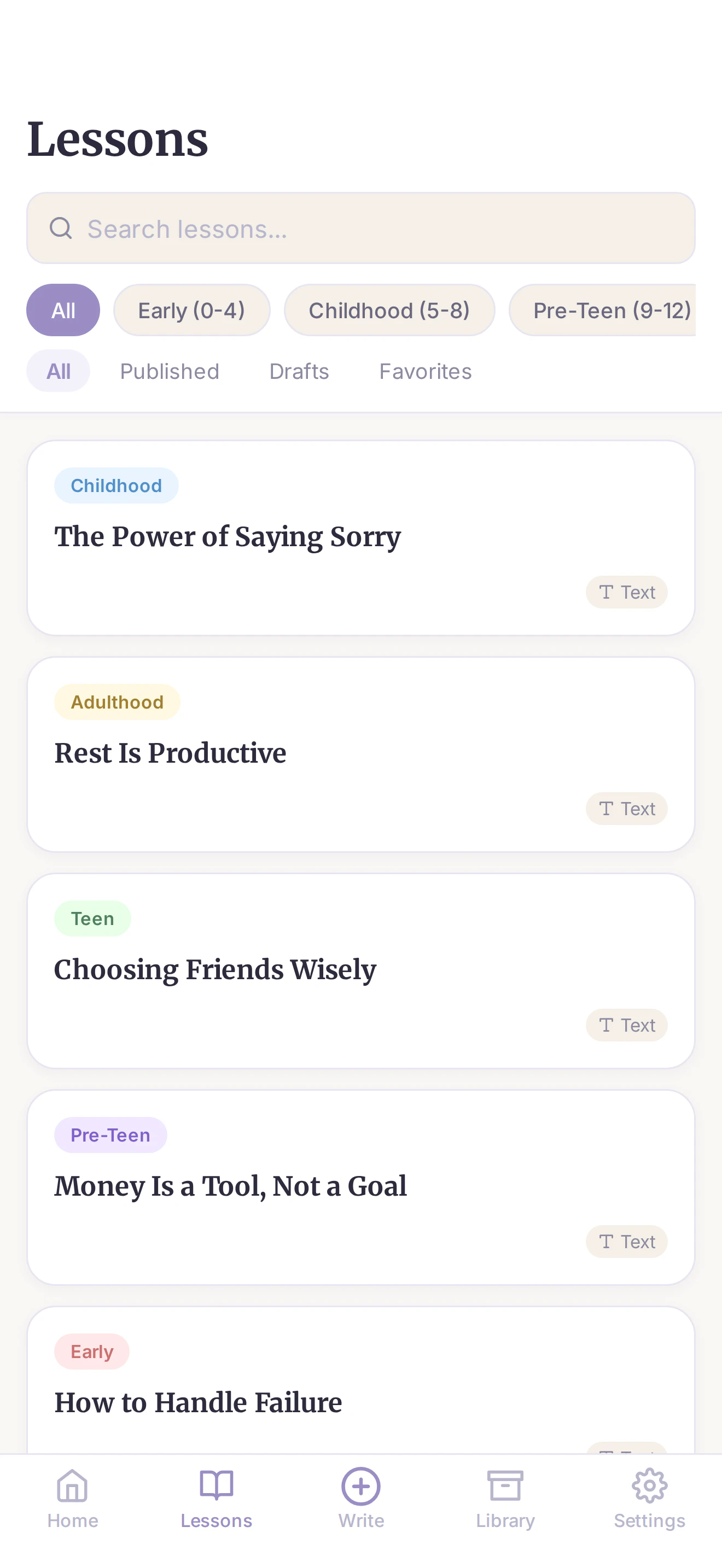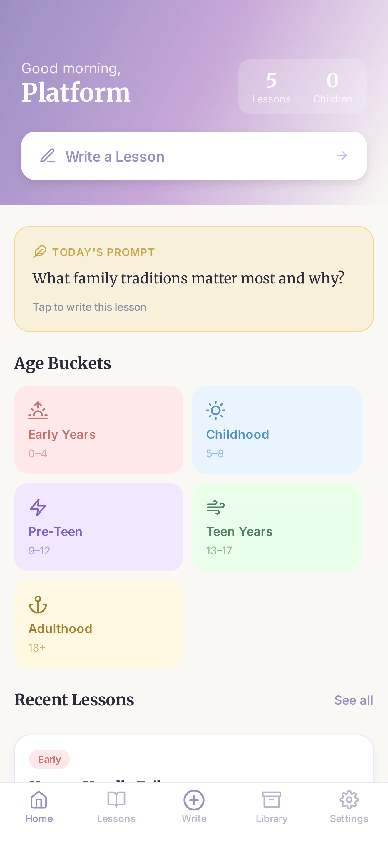 Life Lessons is a private app where parents write letters and record voice notes for their children — organized by age and life topic, unlocked when they need it most. Write about love, courage, money, or purpose. Set lessons to open when your child turns 13, 18, or 25. Record in your own voice so they hear you years from now. No social feed. No notifications. Just your wisdom, preserved for the people who matter most.