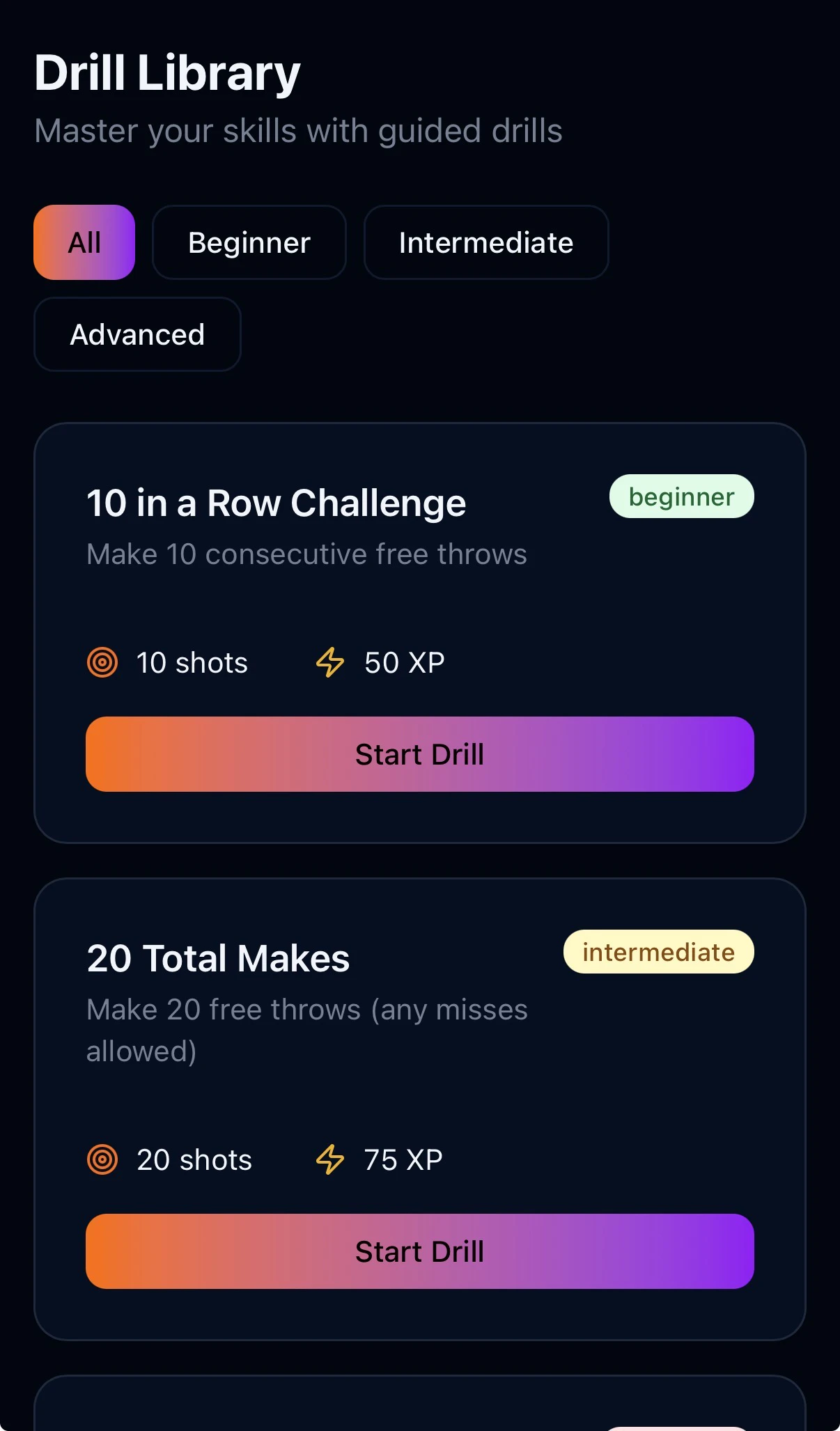 A real-time basketball shot tracking app that uses the phone camera and AI to detect shooting location and make/miss, then shows session accuracy stats by shot type.