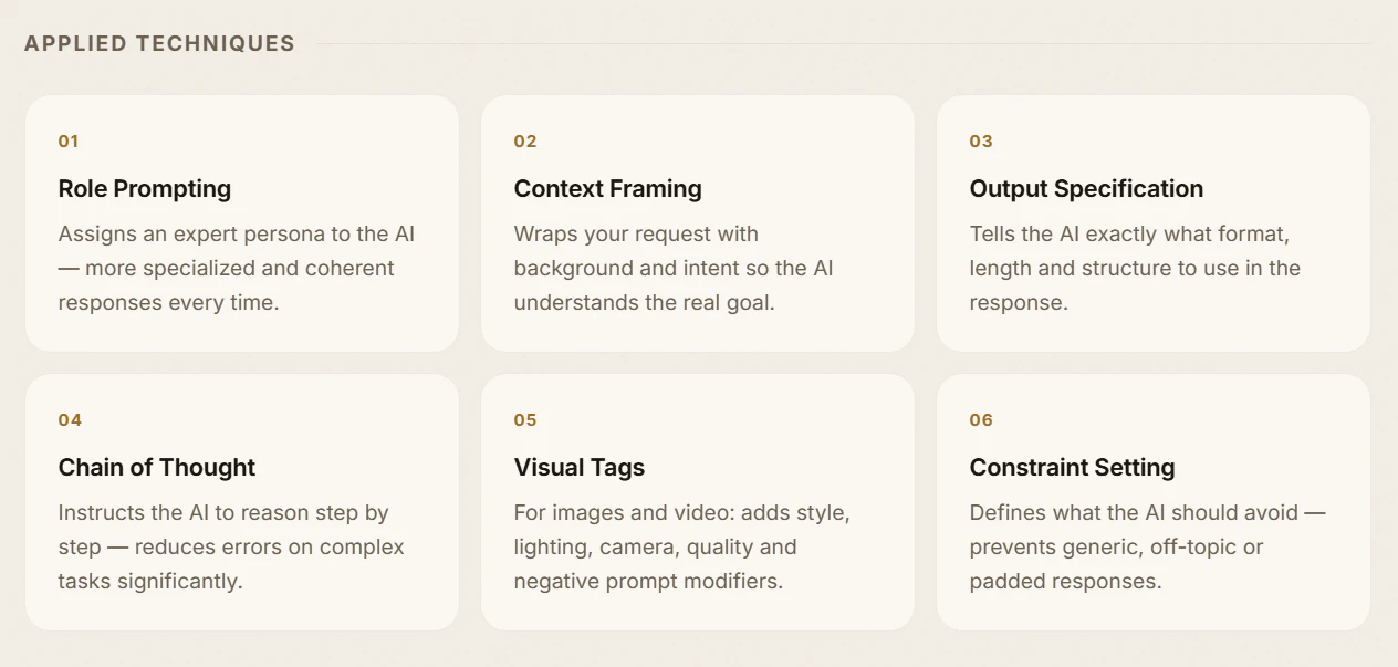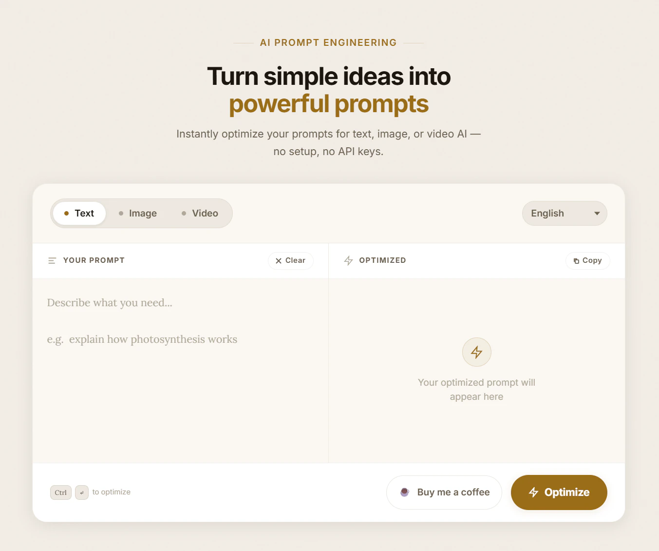 PromptCraft is a free AI prompt optimizer that instantly rewrites your prompts to get dramatically better results from ChatGPT, Midjourney, Runway, and other AI tools. No signup, no paywalls — just paste your prompt, pick the type (text, image, or video), and get a professionally optimized version in seconds, powered by Llama 3.3 70B.