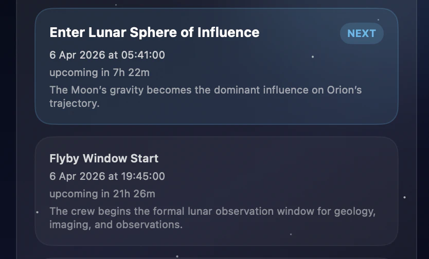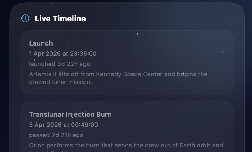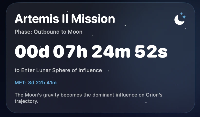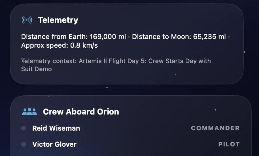 A macOS menu bar app built with SwiftUI that tracks NASA’s Artemis II mission in real time, showing mission phases, countdowns to key lunar flyby and return events, mission elapsed time, crew, live telemetry context, and a space-themed Earth-Moon-Orion timeline. Uses publicly available NASA mission data and timeline updates.