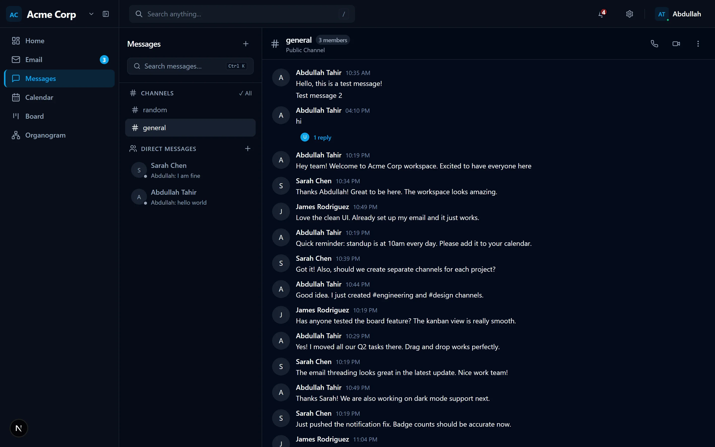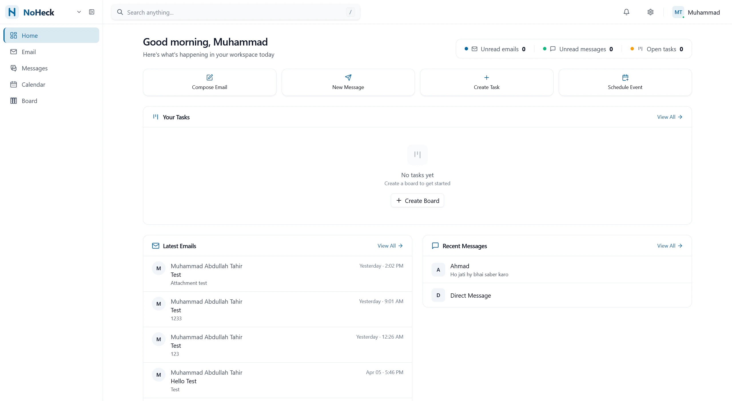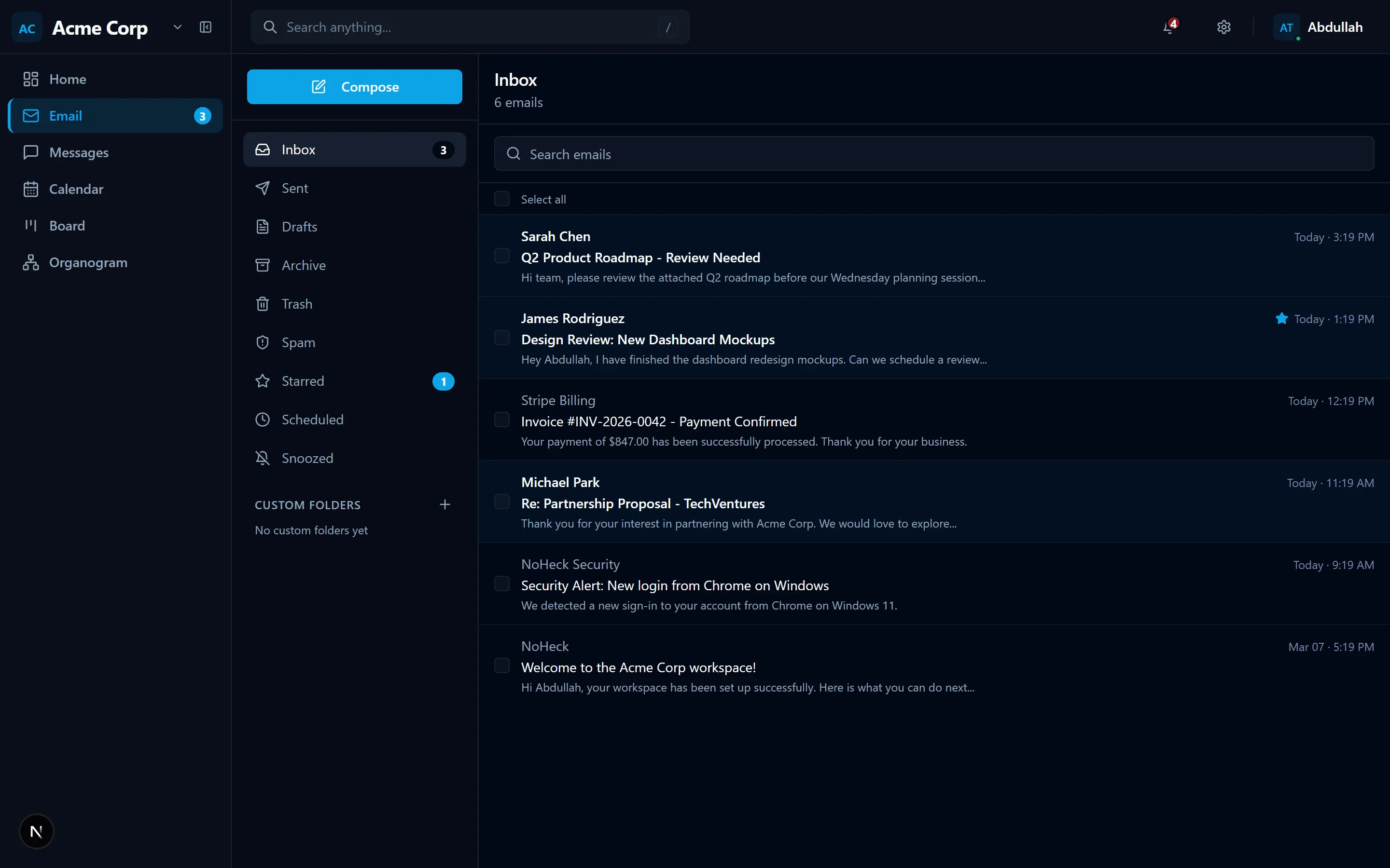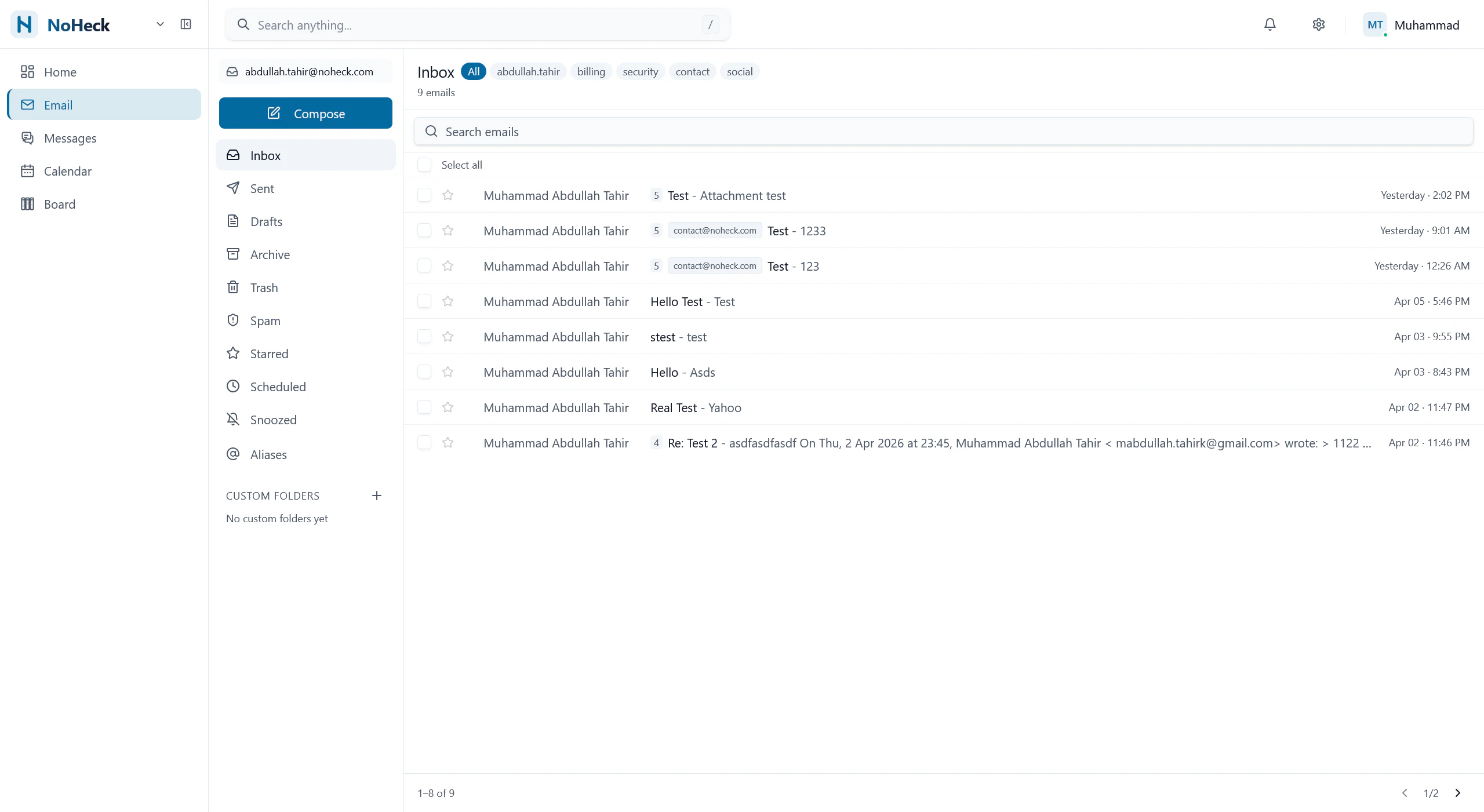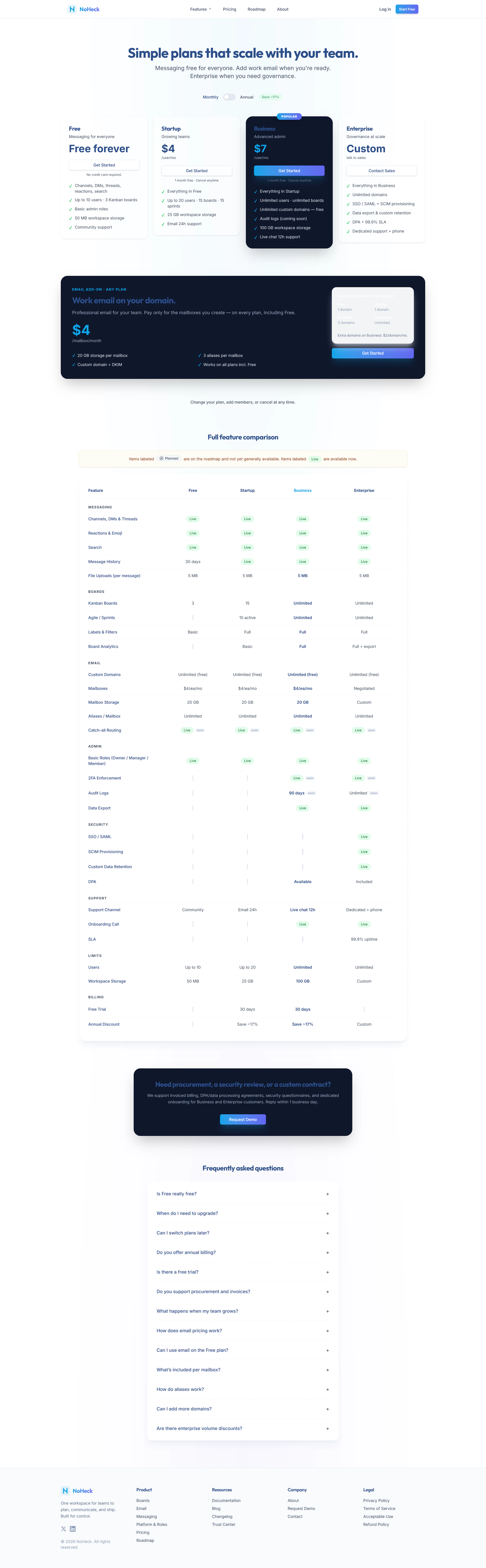 NoHeck unifies email hosting and team messaging in one workspace. Custom domains, DKIM, channels, threads — free to start, no credit card required.