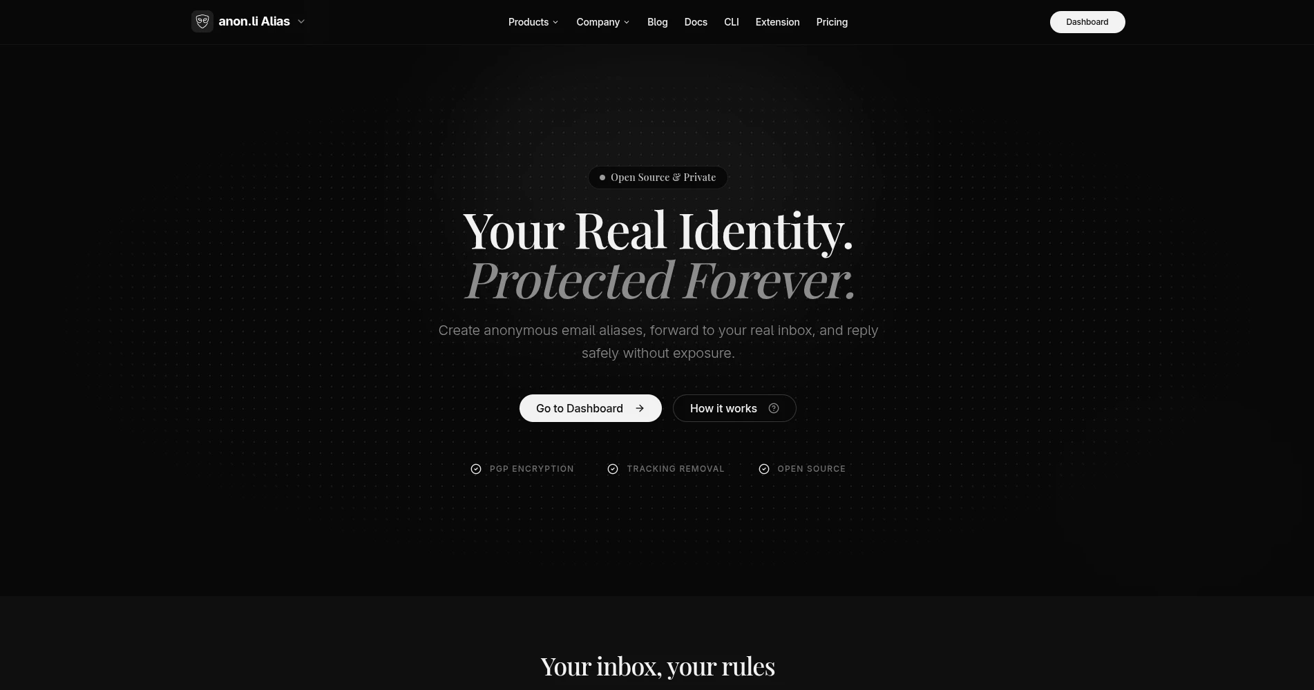 Protect your identity with anonymous email aliases and end-to-end encrypted file sharing. Forward emails to your real inbox without exposing your personal address. Zero-knowledge, open source security, and privacy-focused.
