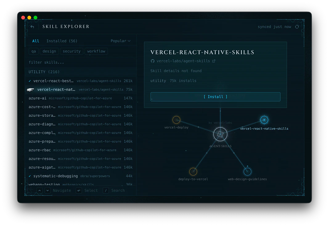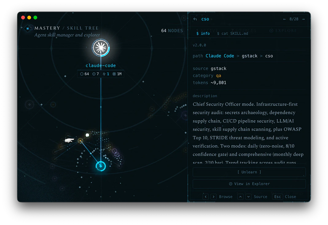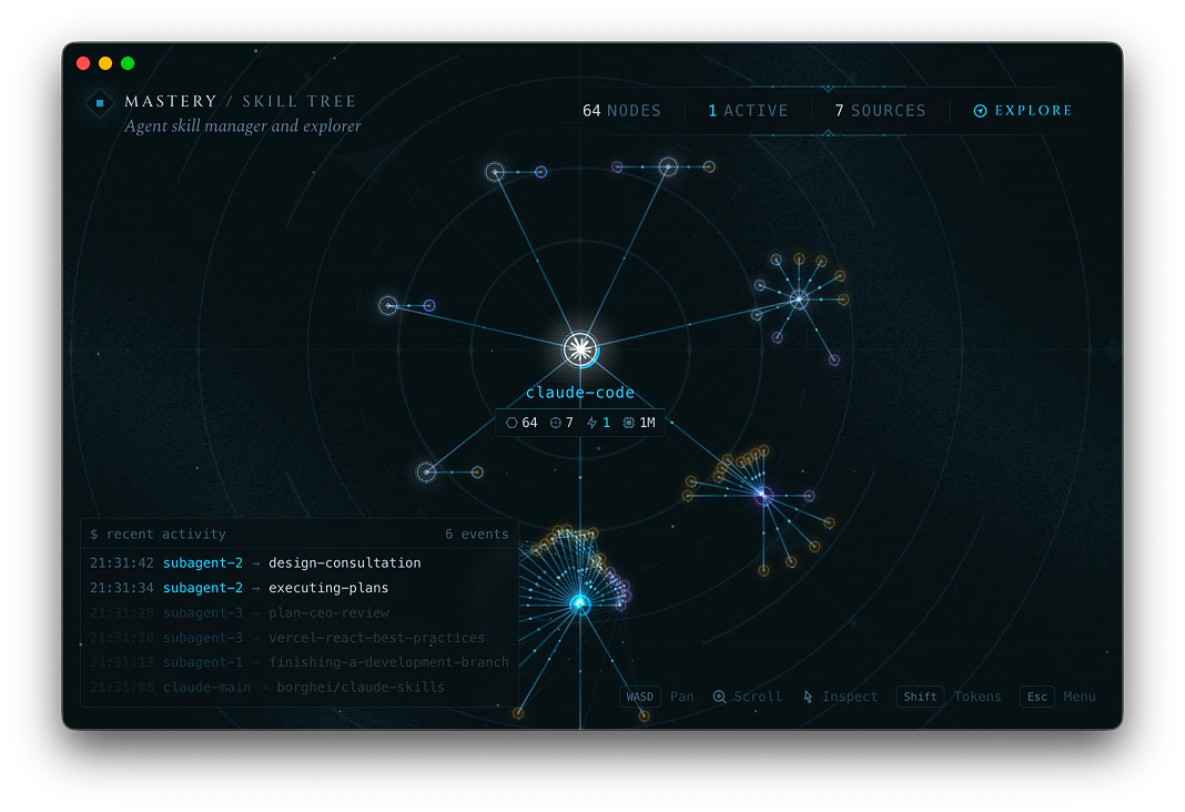 Mastery is an interactive skill tree desktop app to manage, browse, and discover AI agent skills — visualized with classic RPG game UI. Currently supporting Claude Code but soon to support other agents, you can explore your skills, see the token consumption, review the skill.md files, and easily toggle skills without uninstalling. Browse, discover, and install skills directly from the UI. Future versions will let you create and customize multiple skill trees.