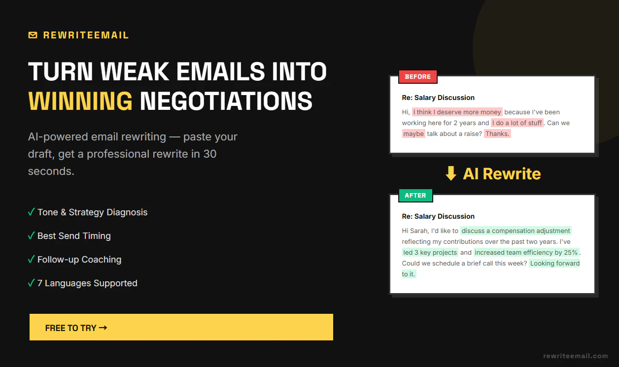 RewriteEmail is a free AI email rewriting tool for professionals. Paste your rough draft → get a polished rewrite in 30 seconds. 🎯 Why it's different from ChatGPT: - Purpose-built for email tone, urgency & persuasion - Full strategy diagnosis, not just grammar fixes - Best send timing recommendations - Follow-up coaching when you get a reply - Supports 7 languages Perfect for negotiations, complaints, cold outreach & job applications. Free to start (3 rewrites, no signup). Premium: $7.90/mo.