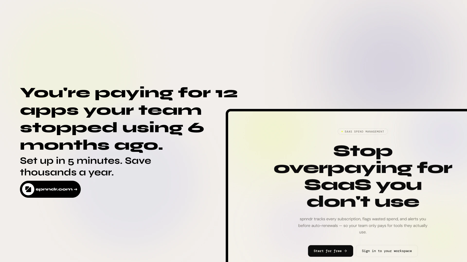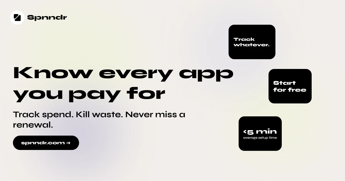 spnndr helps you track every subscription in one place, uncover hidden spend, and avoid surprise renewals. Most people and teams lose money on tools they forgot they’re paying for — spnndr makes that visible instantly. Get alerts before renewals, see exactly where your money goes, and cut waste in seconds.