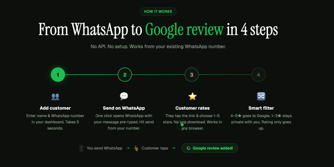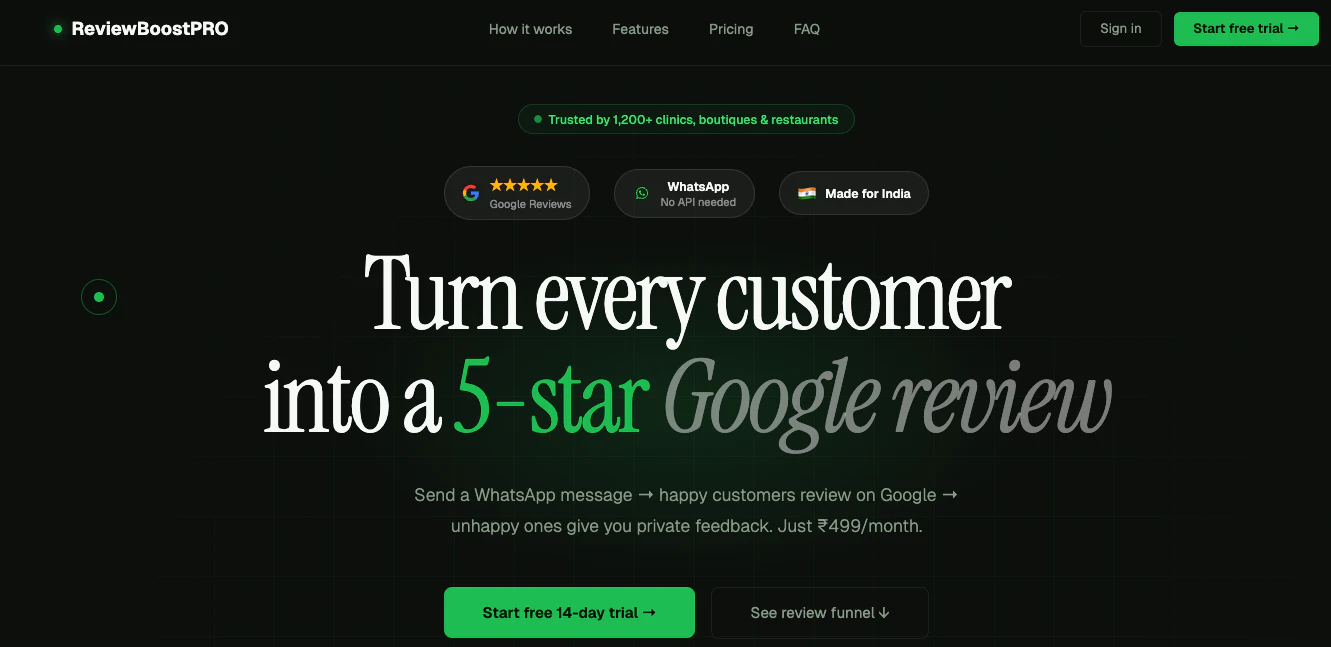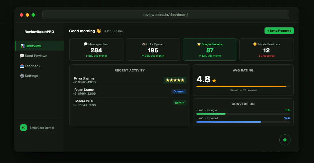 Send WhatsApp review requests to customers and get more 5-star Google reviews automatically. Smart review funnel for clinics, restaurants, salons & boutiques across India. Just ₹499/month.