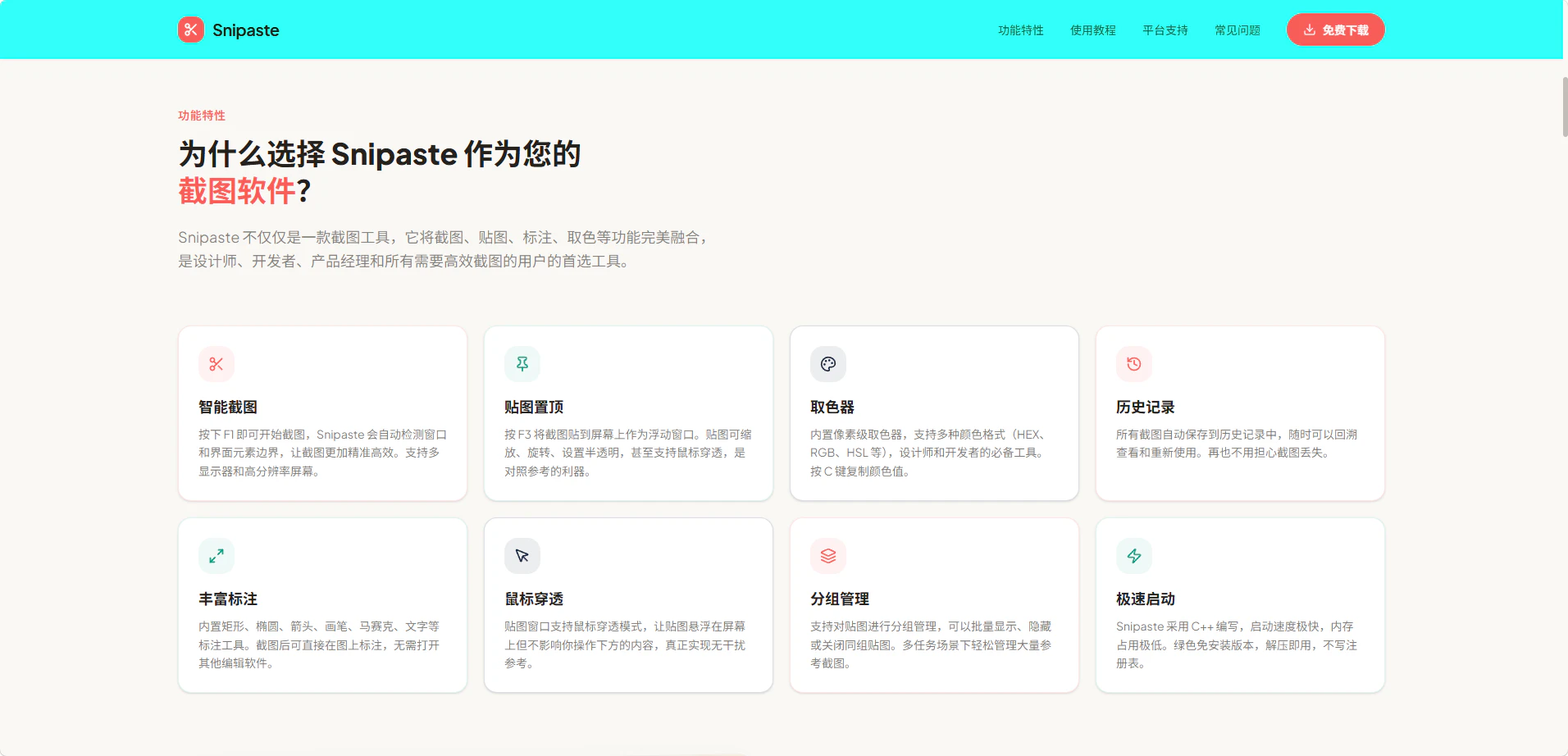 Snipaste是一款简单强大的免费截图工具,支持截图、贴图、标注等功能。按F1截图,F3贴图,支持Windows/Mac/Linux多平台。立即下载Snipaste,提升您的工作效率。 Snipaste is a free, lightweight screenshot and annotation tool that revolutionizes how you work with screenshots. Key Features: • Floating Paste (F3) - Keep screenshots visible while working • Smart Screenshot (F1) - One-click window capture • Built-in Annotation Tools - Draw, highlight, blur Perfect for designers, developers, teachers, and content creators.
