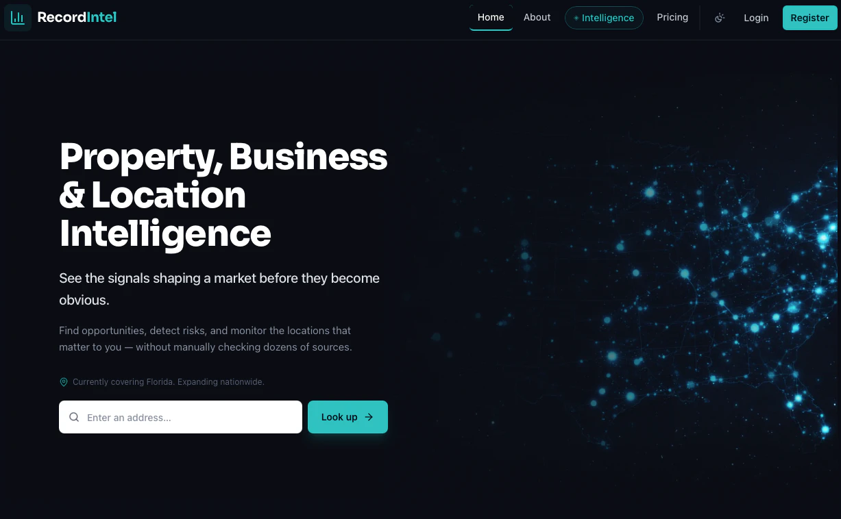 RecordIntel gives instant access to property records, business filings, market signals, and location data — all in one place.