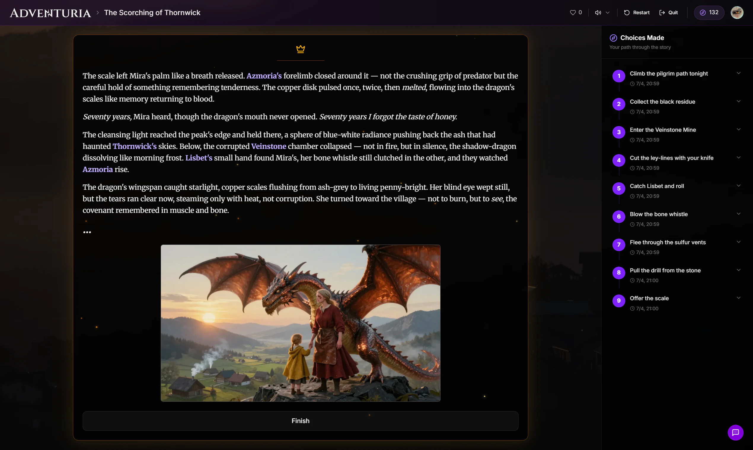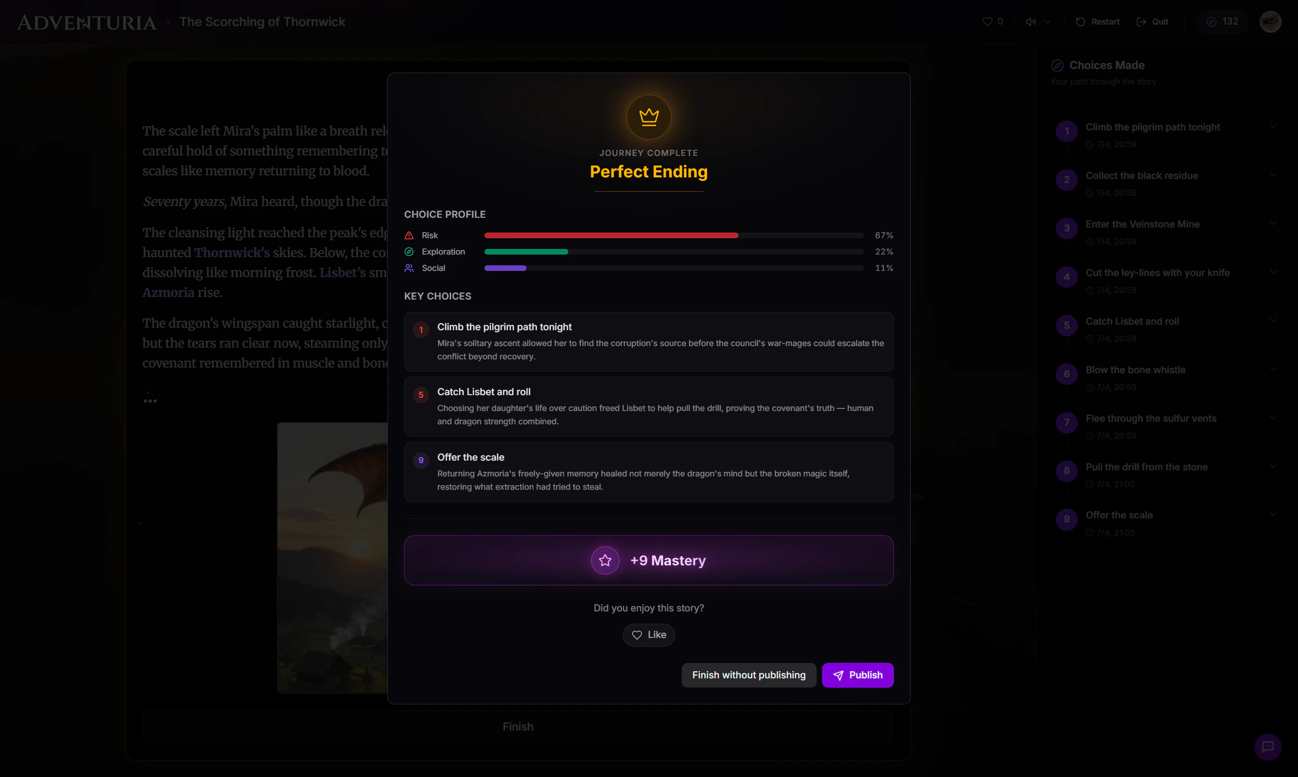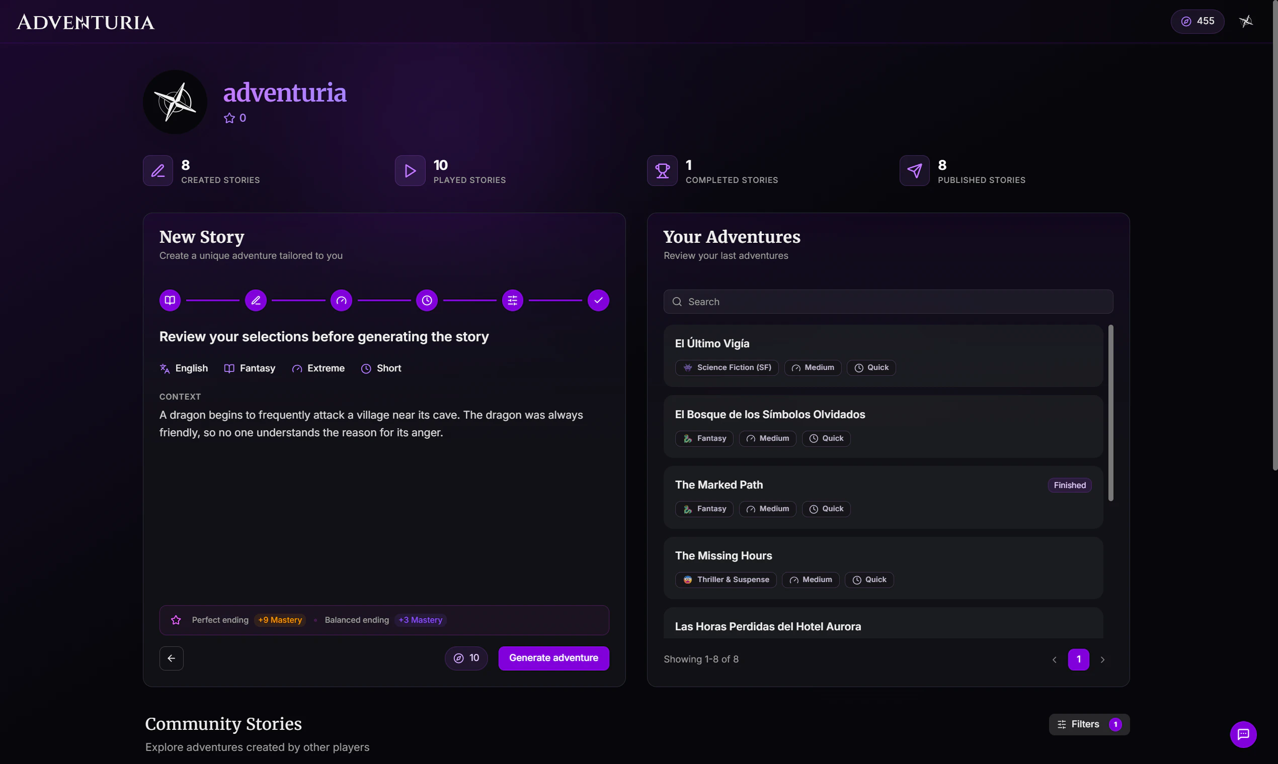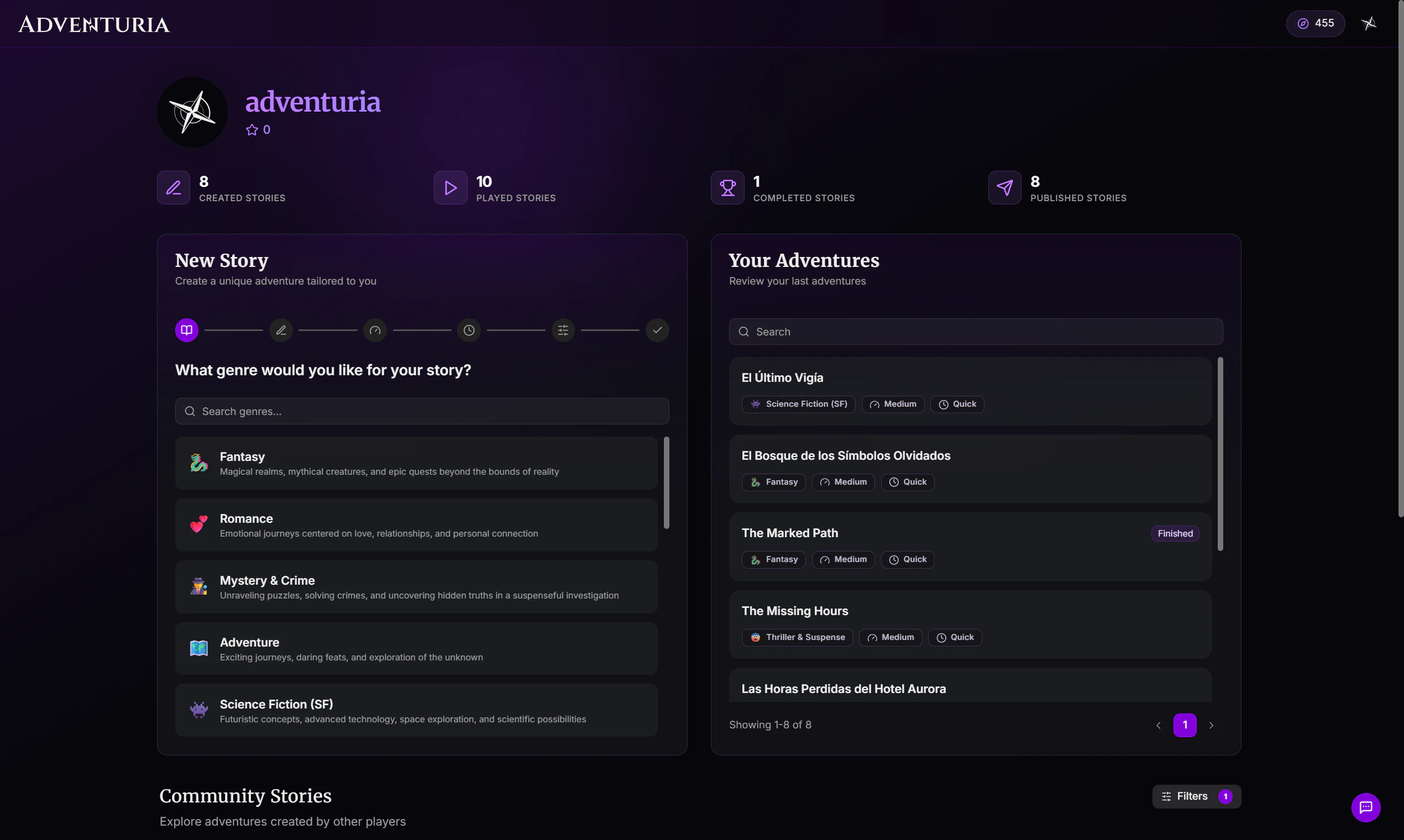 Adventuria lets you create, play, and share interactive stories powered by AI. Pick a genre, describe your world, and the AI crafts a branching narrative where every decision shapes the course of the story. No two playthroughs are the same; replay to discover new paths and endings. You can also let AI generate images to bring each scene to life. Publish your adventures for the community, or dive into stories crafted by others. Works on any device, with free demo stories to get started.