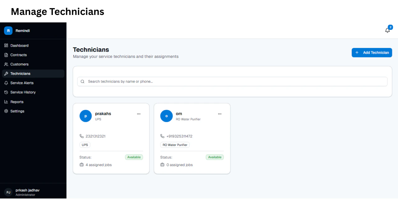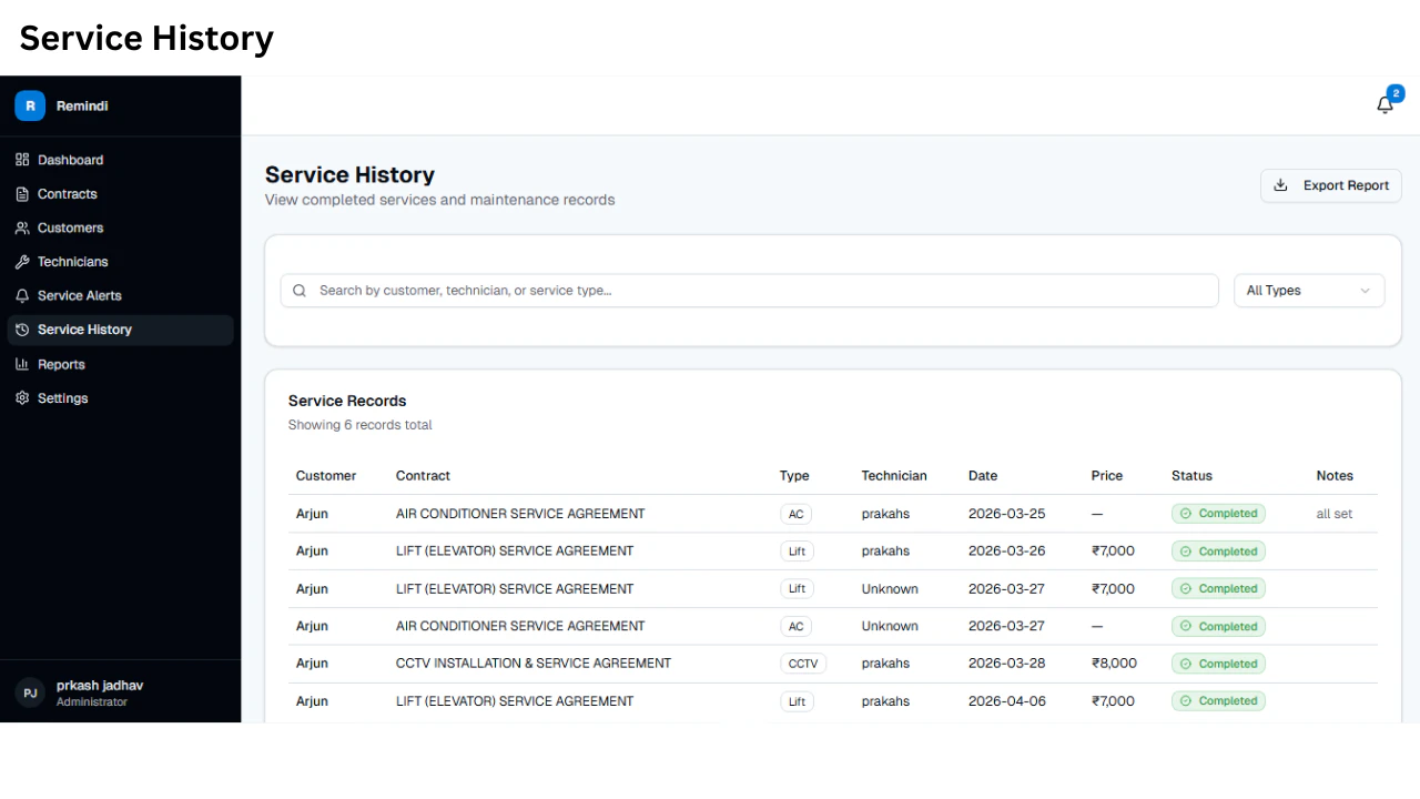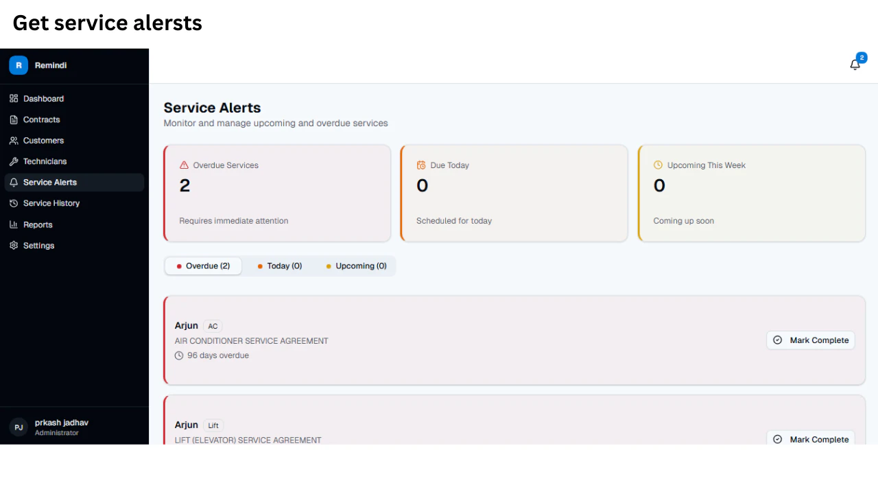 Remindi helps lift, AC, RO, CCTV and pest control contractors in India manage all their AMC clients, track service dates, and get automatic alerts when services are due — completely free.