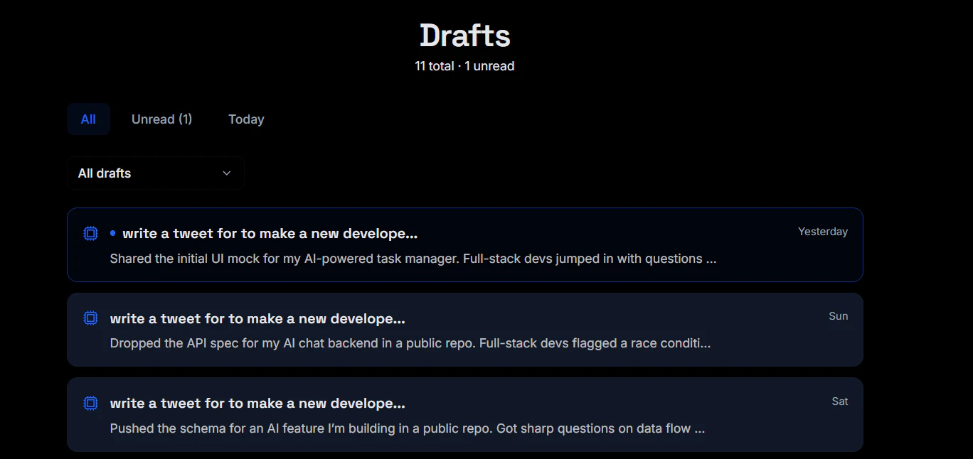 RemindrAI keeps your content moving. It’s built for creators, founders, and professionals who don’t struggle with ideas - they struggle with consistency. You set what you want to write about and when. At that moment, a fresh draft is ready. No blank page. No starting from scratch. You define your voice and topics once - the system continues from there.