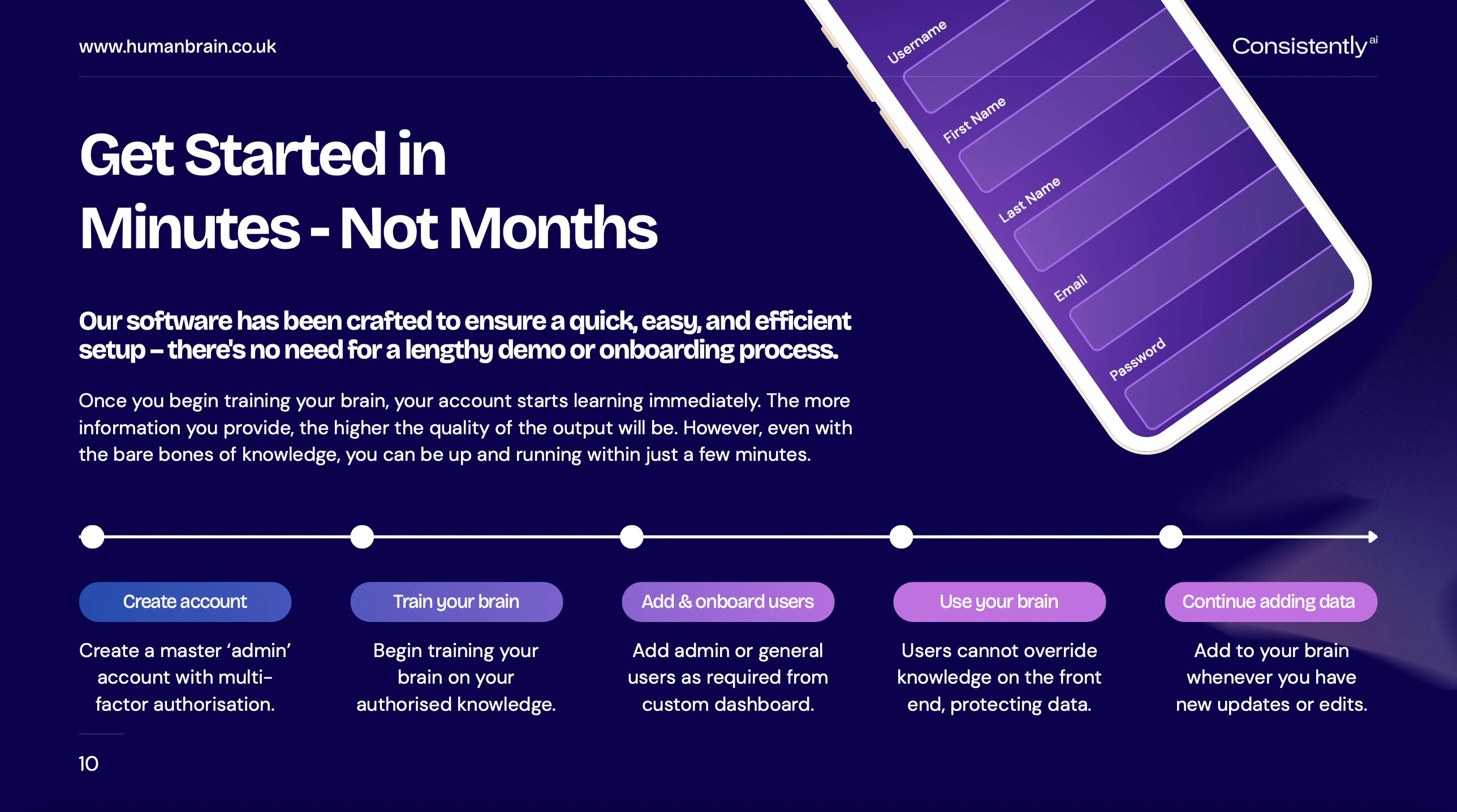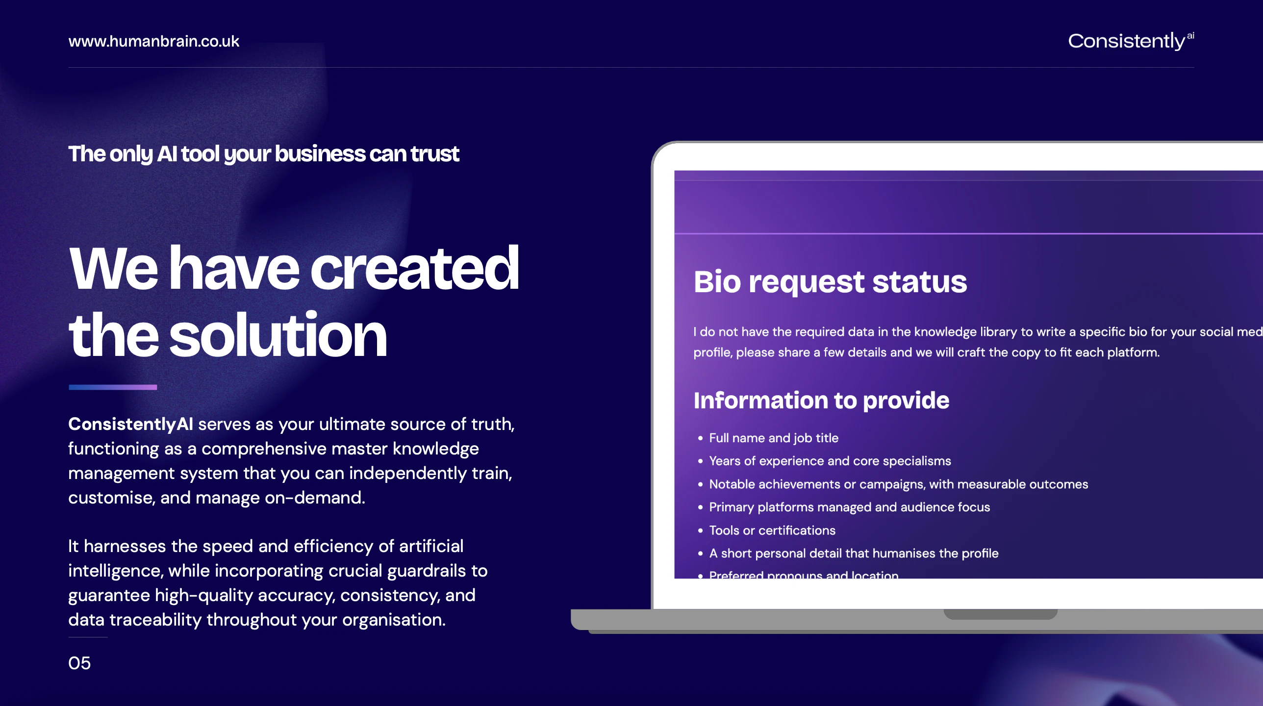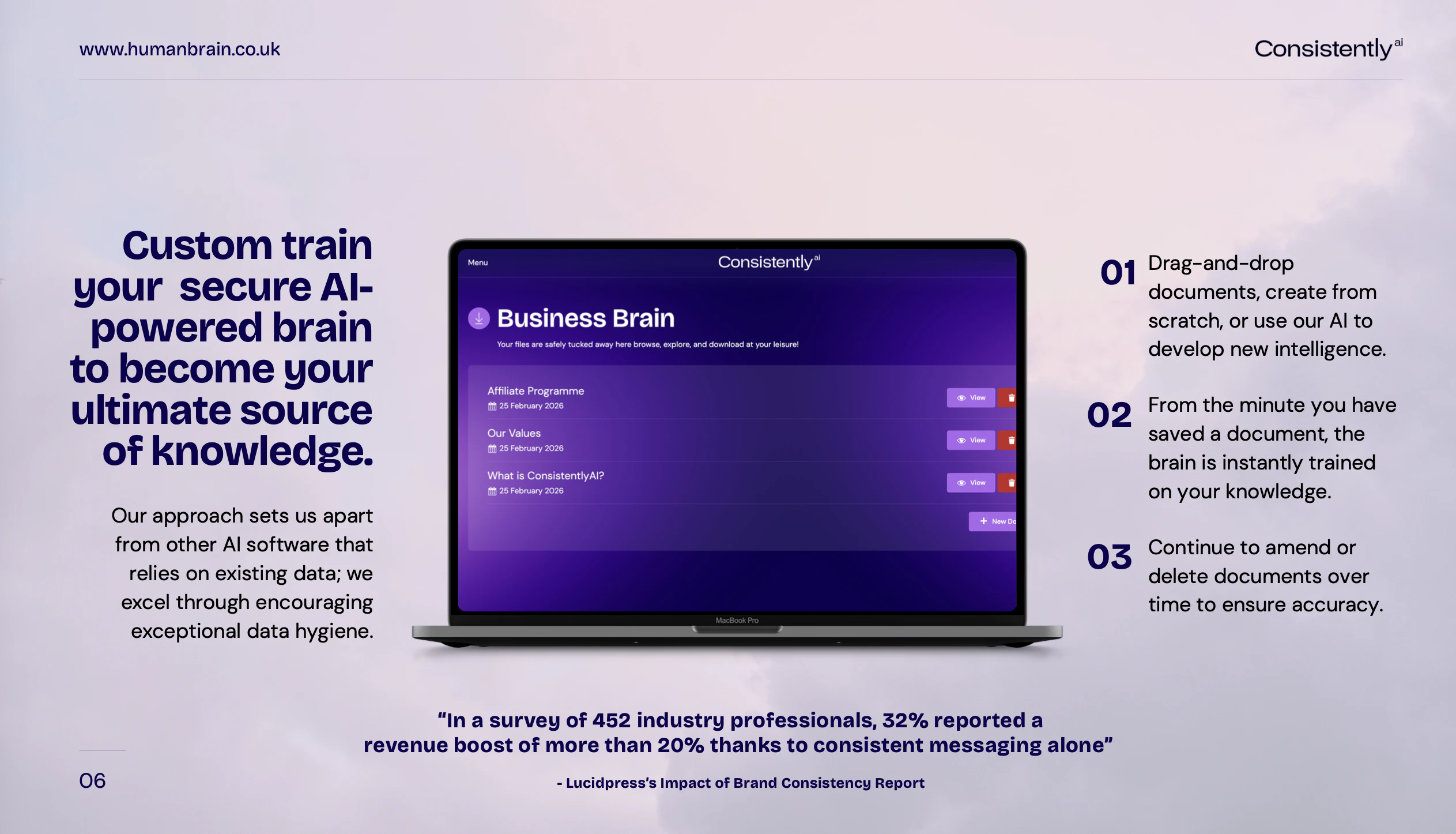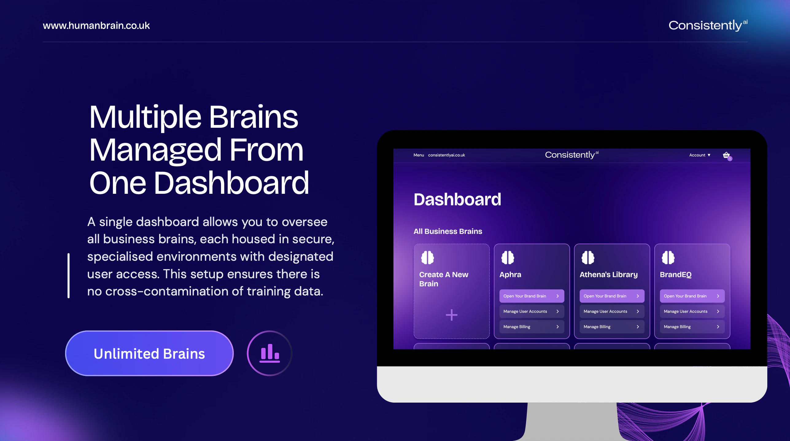 Most AI systems rely on messy, fragmented data, and lack the essential guardrails that responsibly safeguard human intelligence. This introduces inefficiencies, risks, and corrective costs. ConsistentlyAI is the only AI tool your business can trust. Build a custom AI-powered human brain that cannot invent information, present incorrect data, or share sensitive information. Your ultimate source of truth. Manage multiple secure brains, each with their own users, from one single dashboard.