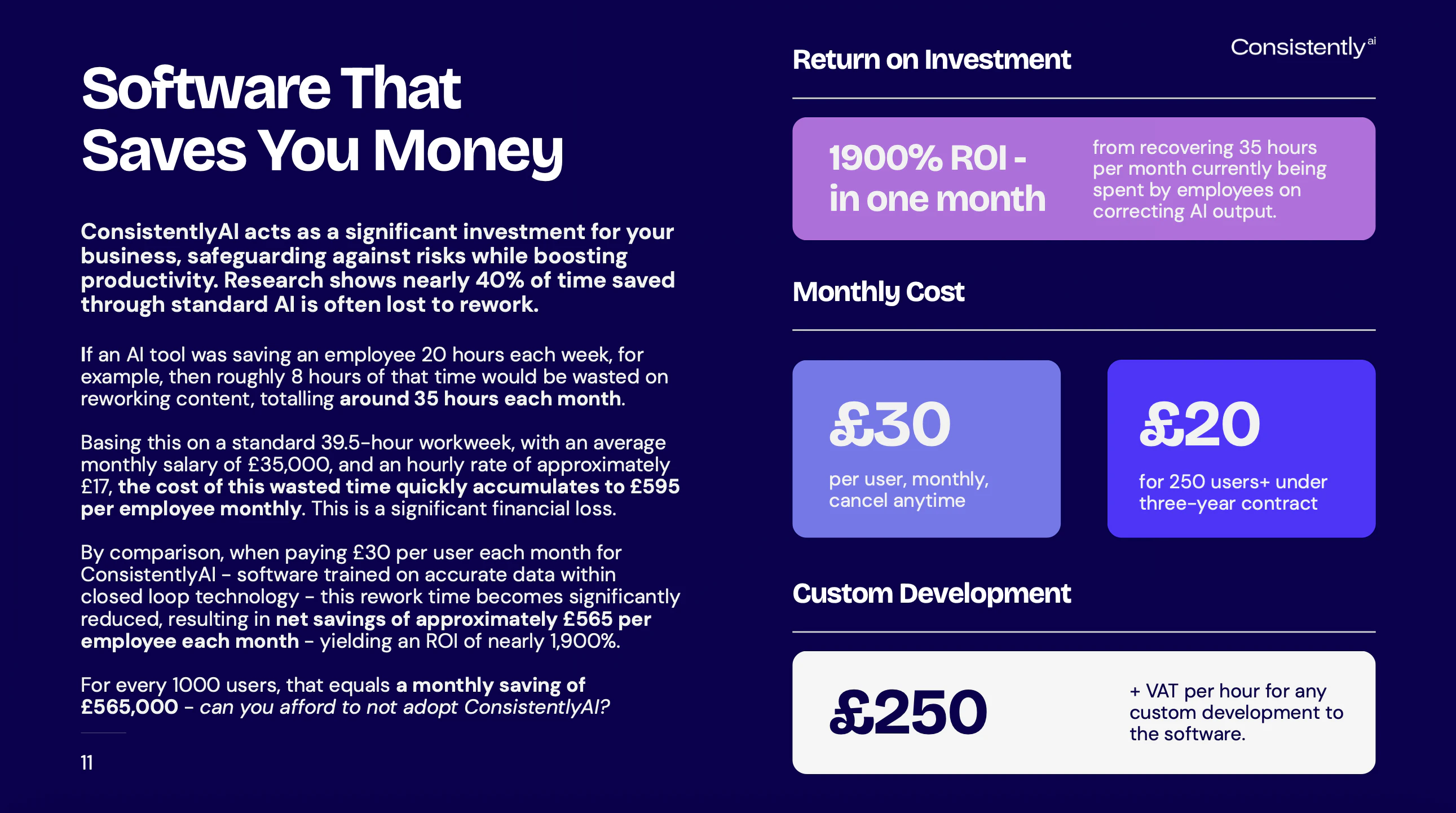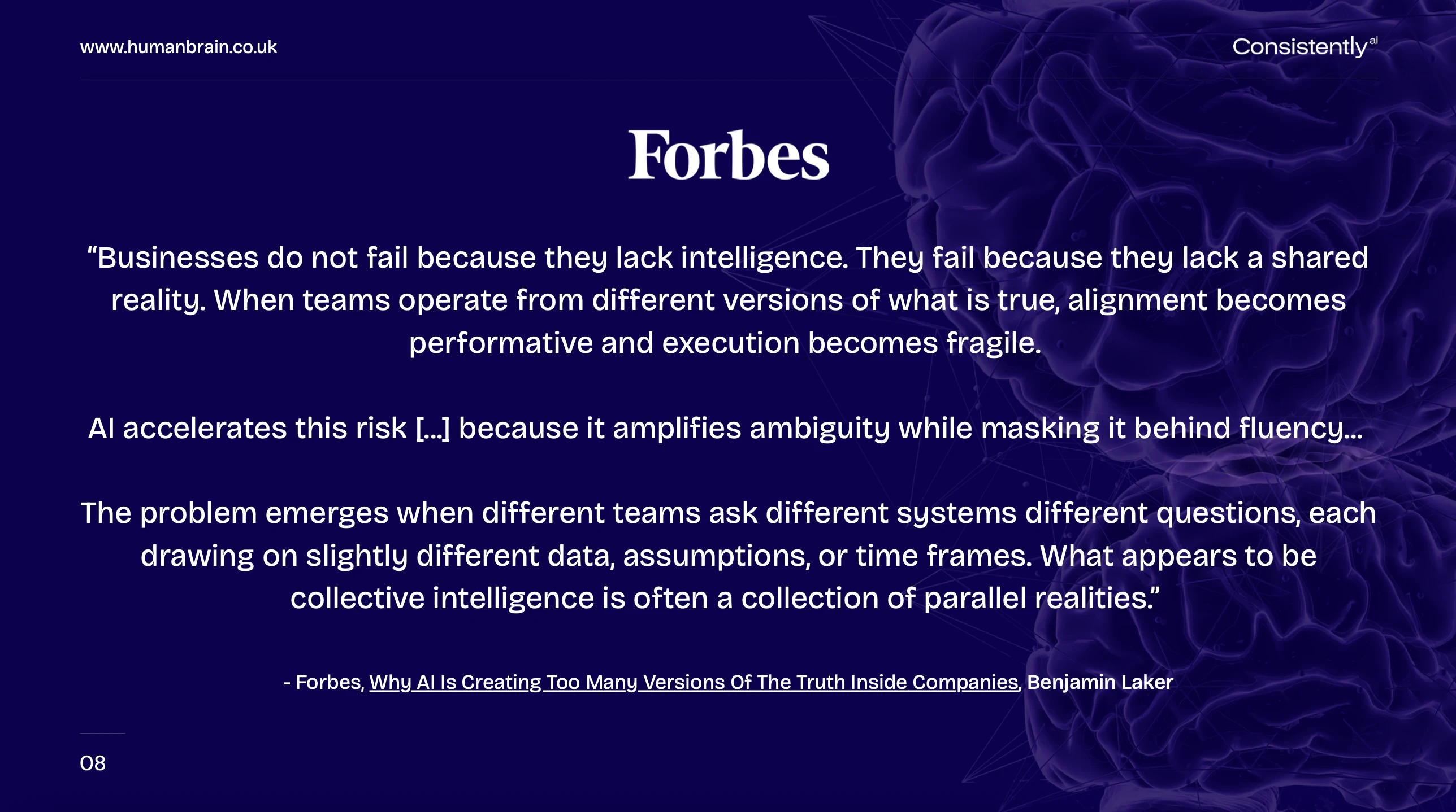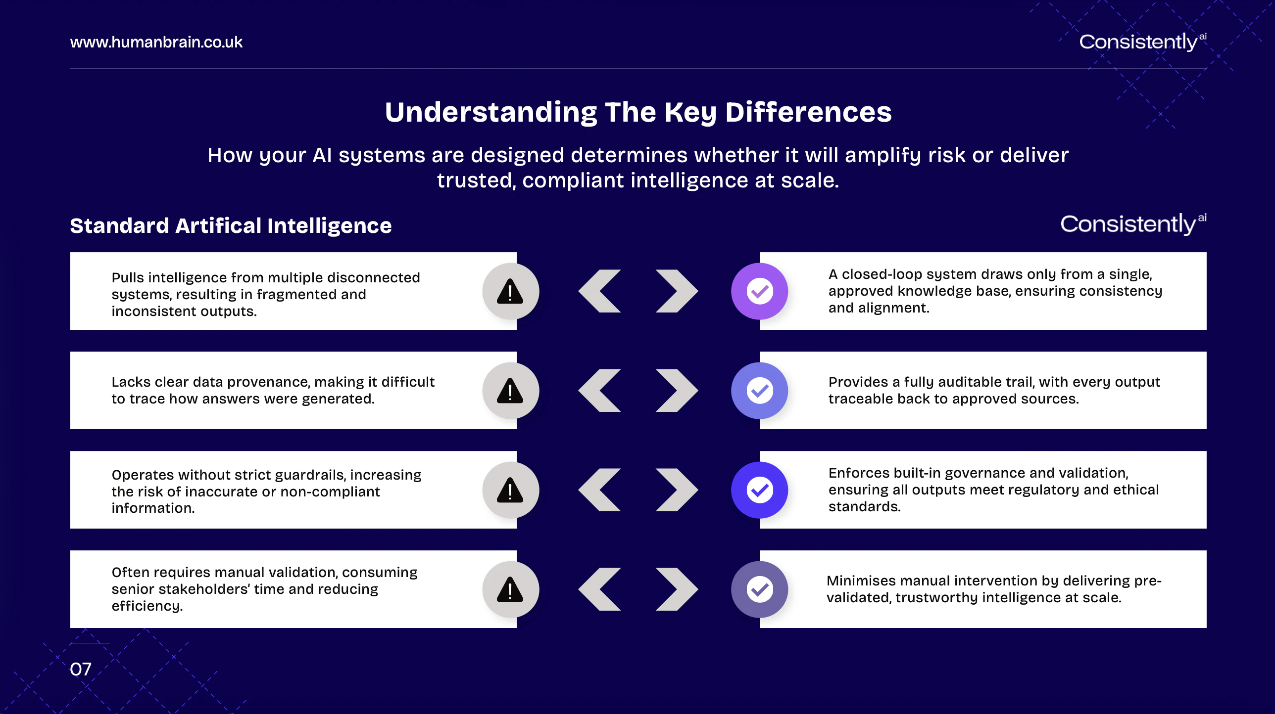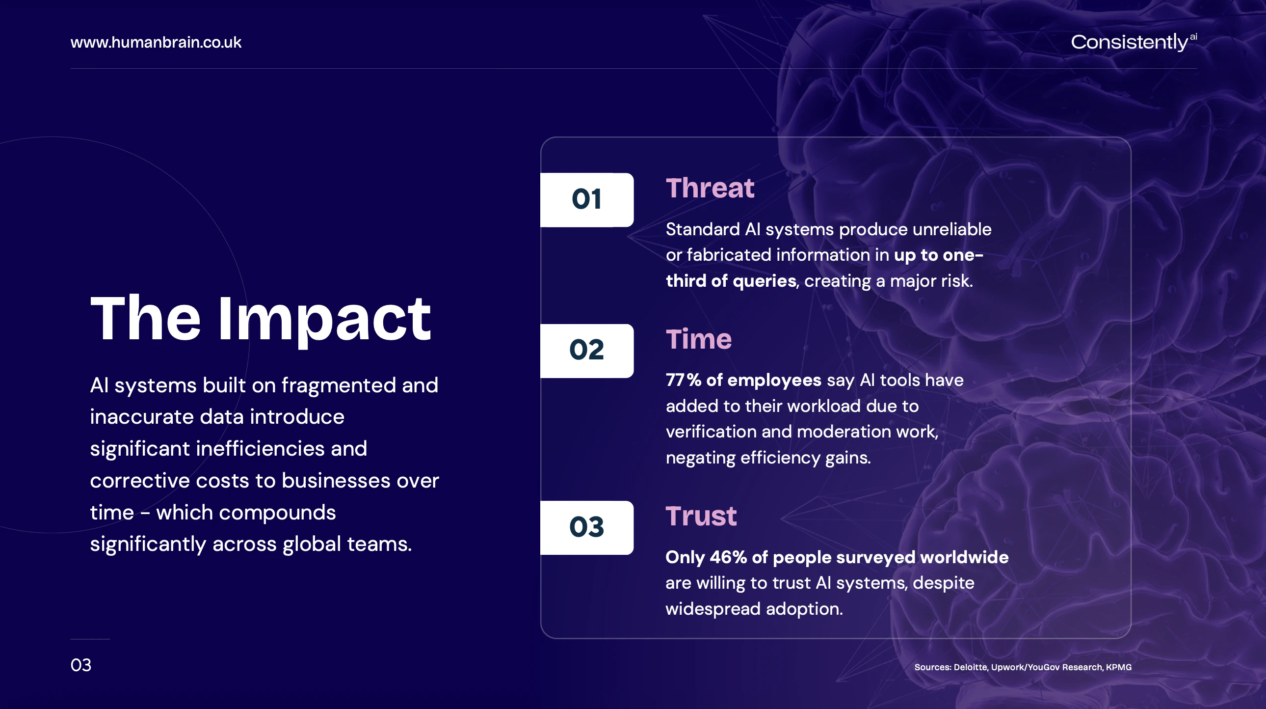 Most AI systems rely on messy, fragmented data, and lack the essential guardrails that responsibly safeguard human intelligence. This introduces inefficiencies, risks, and corrective costs. ConsistentlyAI is the only AI tool your business can trust. Build a custom AI-powered human brain that cannot invent information, present incorrect data, or share sensitive information. Your ultimate source of truth. Manage multiple secure brains, each with their own users, from one single dashboard.