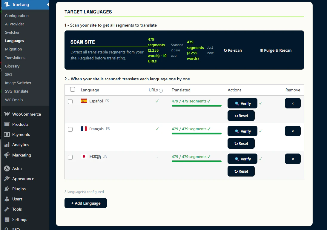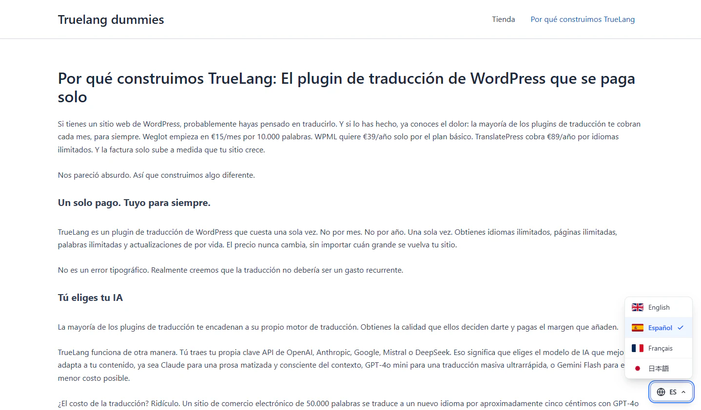 Most translation plugins charge monthly fees that grow with your site. Weglot starts at €15/month, quickly reaches €300+. Stop paying, lose everything. TrueLang: one-time $99. Bring your own AI key (Claude, GPT-4, Gemini, DeepSeek, Mistral). You pick the model, control the cost. 50k words costs ~$0.05. Translations stored in WordPress. No cloud lock-in. Zero runtime API calls - instant loading. WooCommerce, Elementor, Divi compatible. Full SEO. Free plan available.