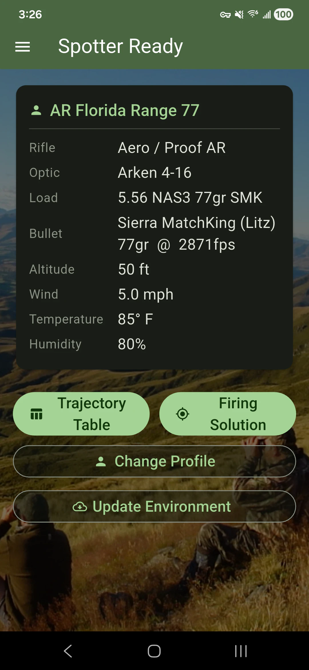 A field-ready ballistics calculator for Android. Spotter Ready computes firing solutions and trajectory tables for precision rifle shooting. It combines a physics-based point-mass ballistics solver with live weather integration, offline voice commands, and a suite of standalone ballistics tools. All your data is yours. You manage your own backups. Nothing is uploaded to us. There is no tracking or advertising.