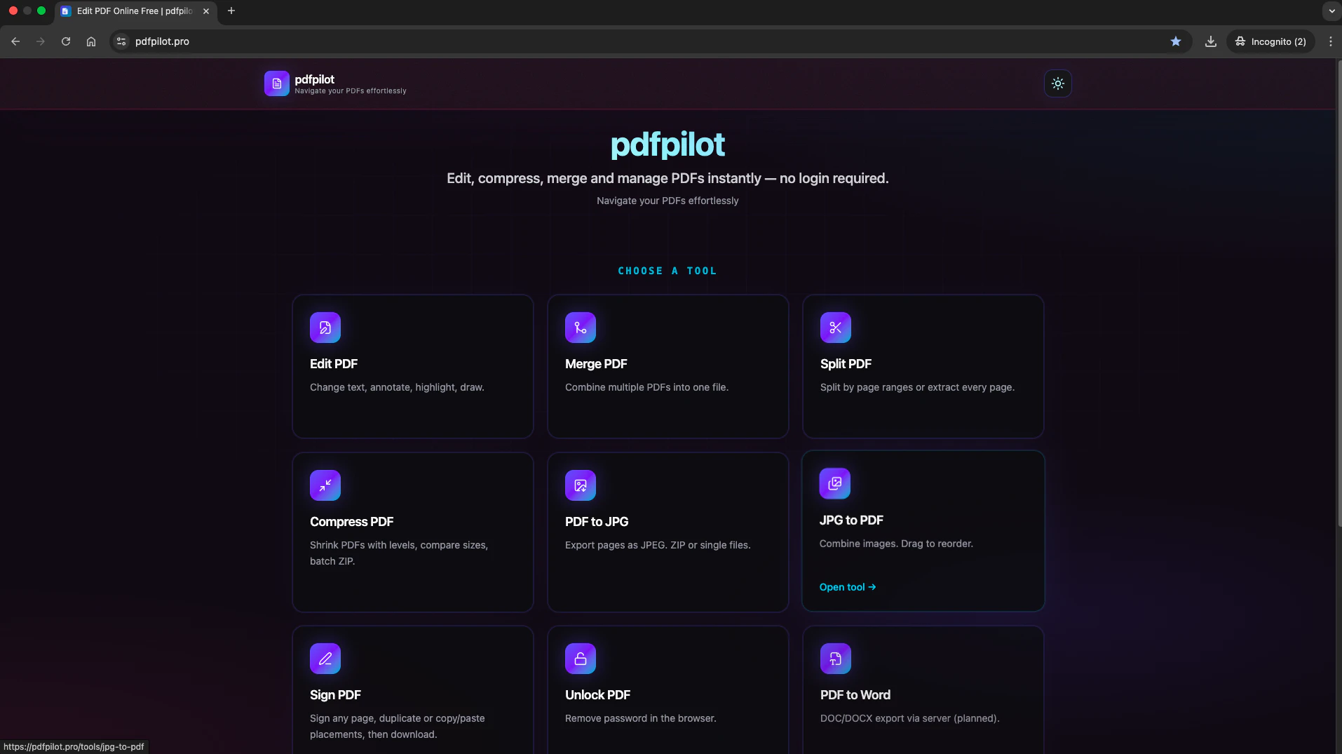 Edit, compress, merge and manage PDFs instantly with pdfpilot. No login required. Free and fast PDF tools.