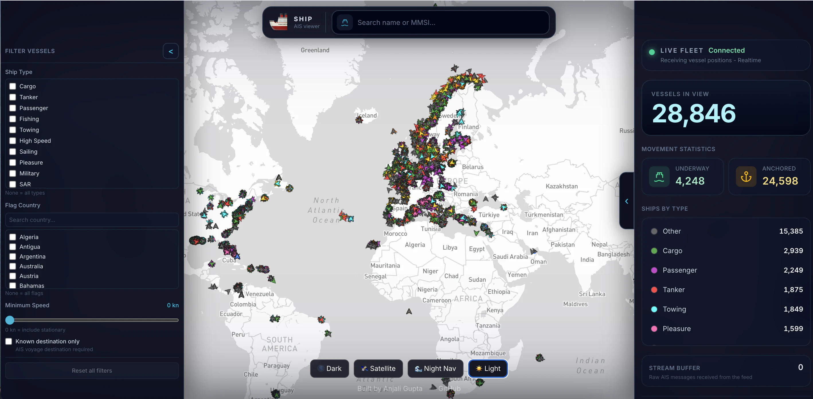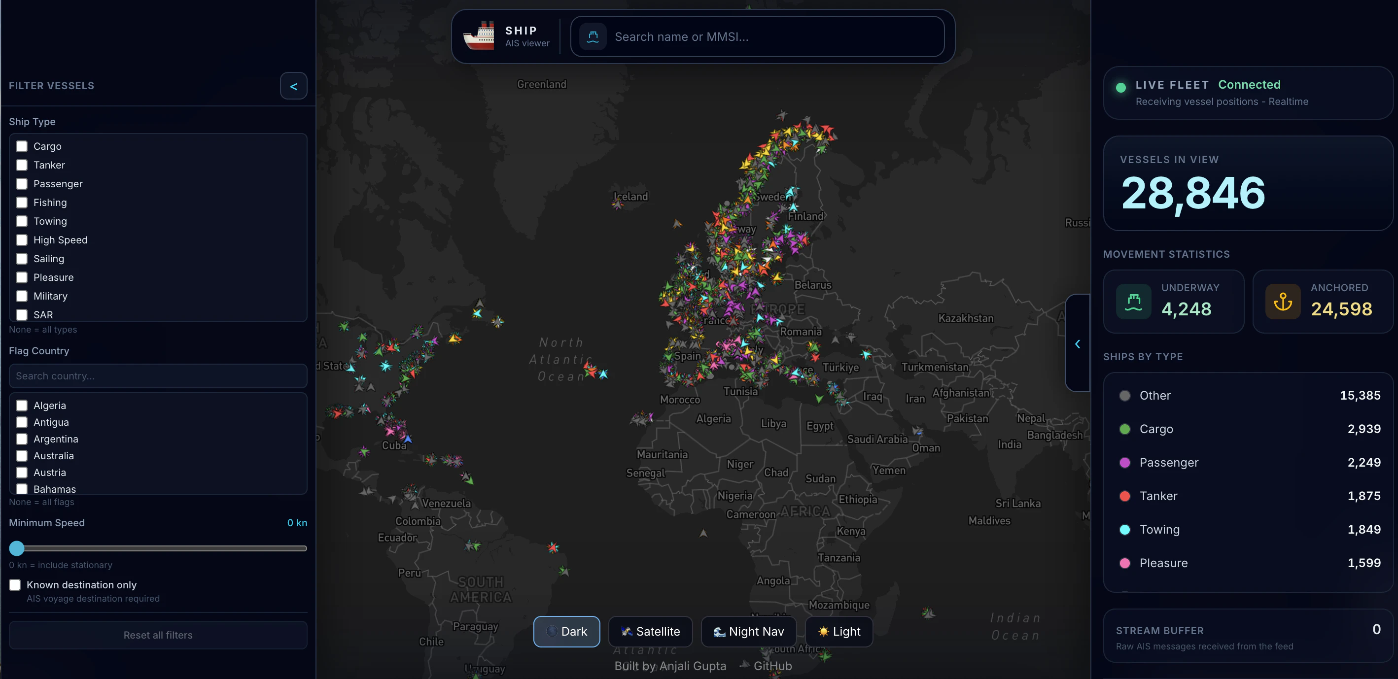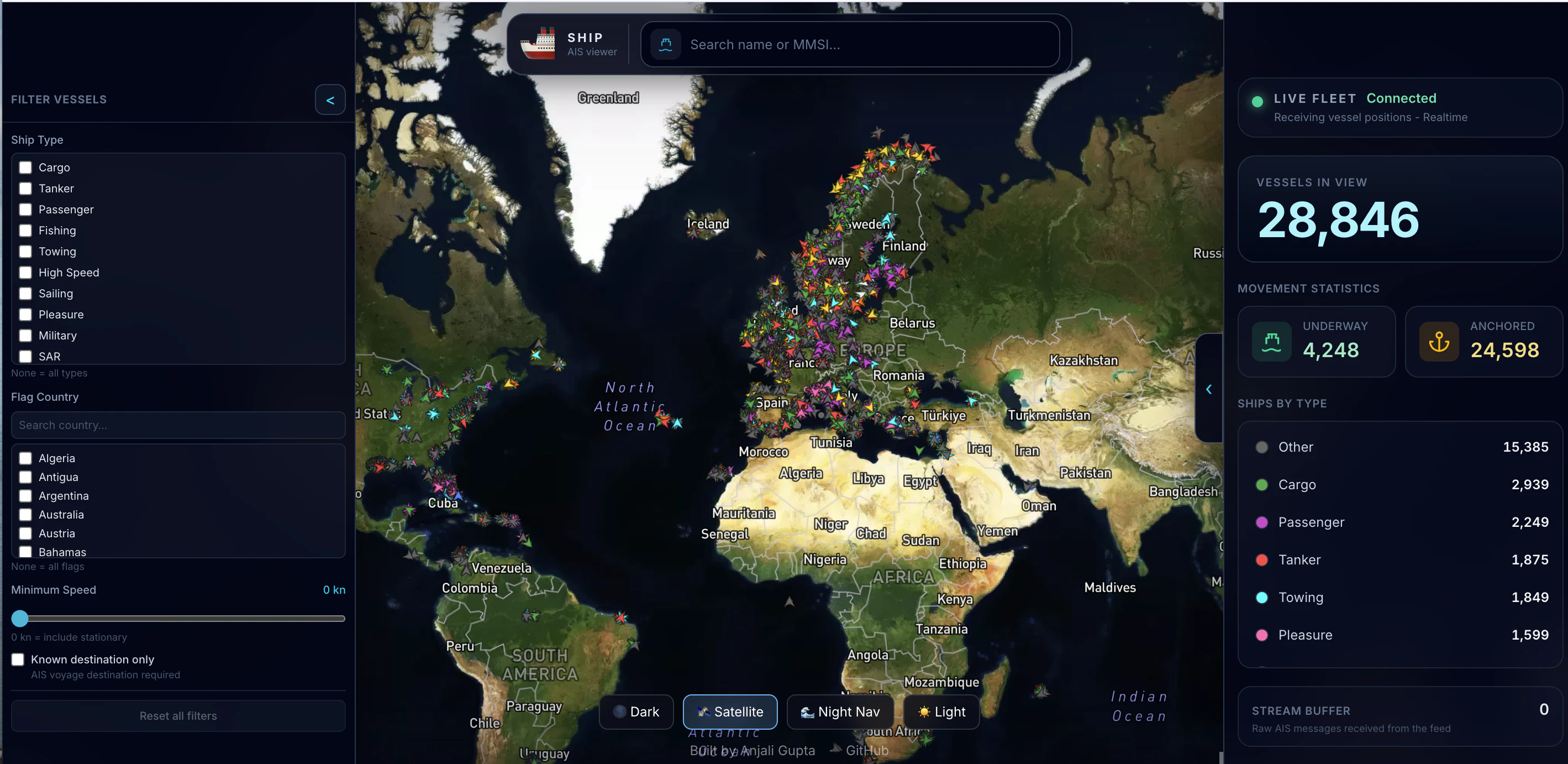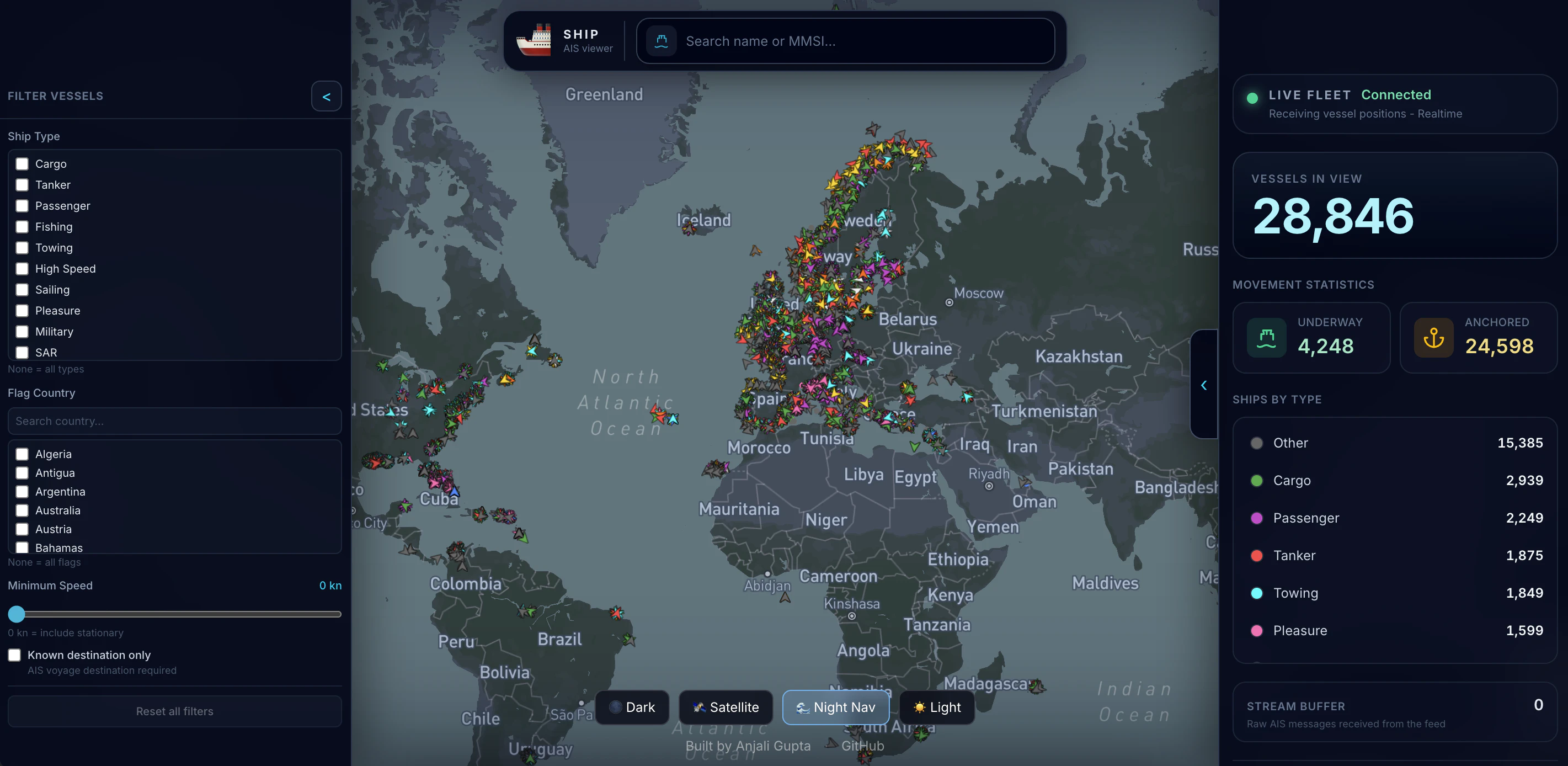 ShipGPS is a free real-time global ship tracking platform built with React, Mapbox, and live AIS data. Track 10,000+ vessels worldwide including: 🚢 Container ships ⛽ Tankers 📦 Cargo ships 🚤 Bulk carriers 🛳️ Passenger vessels Features: - Live AIS data streaming via WebSocket - Filter by ship type, flag country & speed - Supabase-powered instant load (no waiting!) - Satellite, dark & night navigation map styles - Click any ship for full vessel details