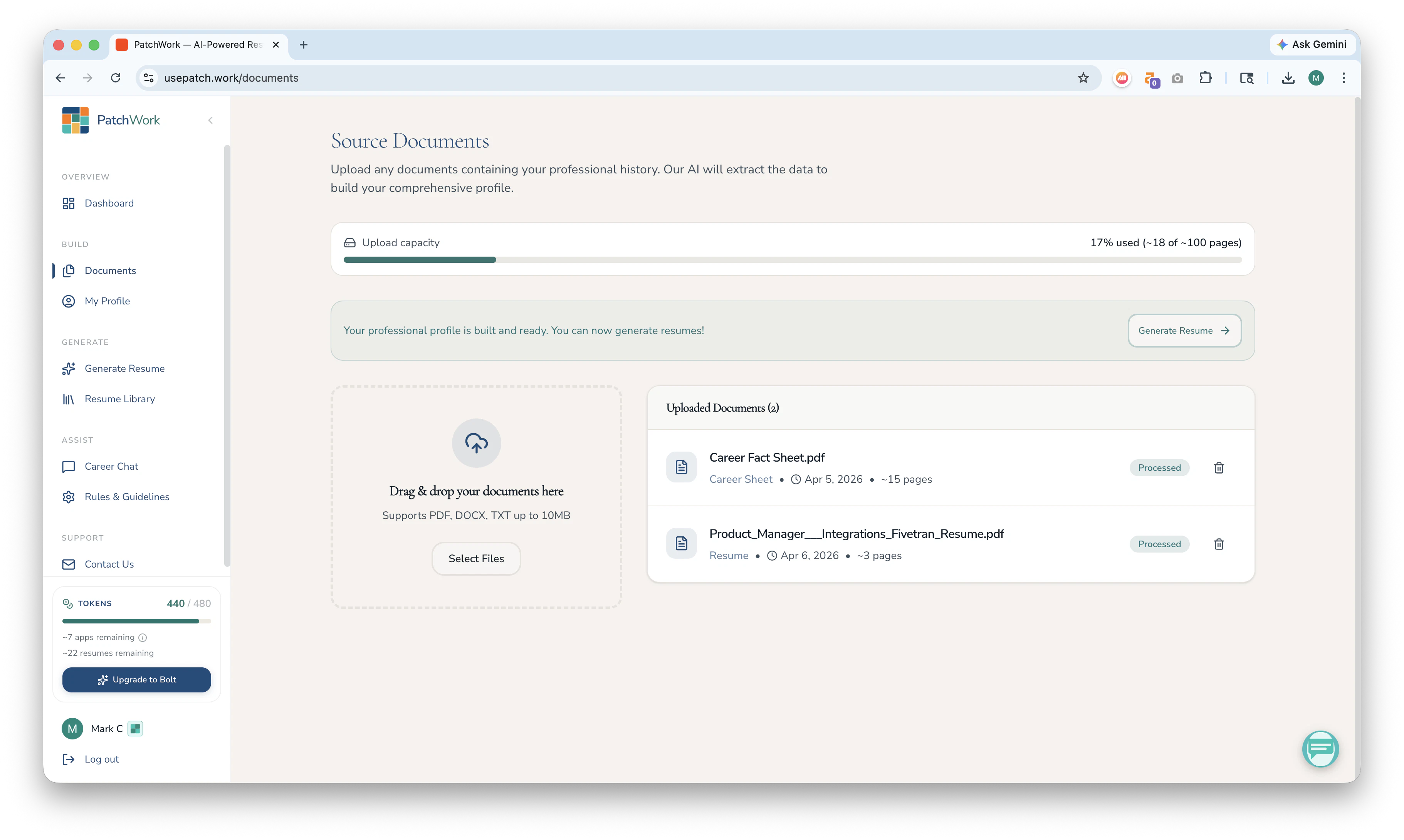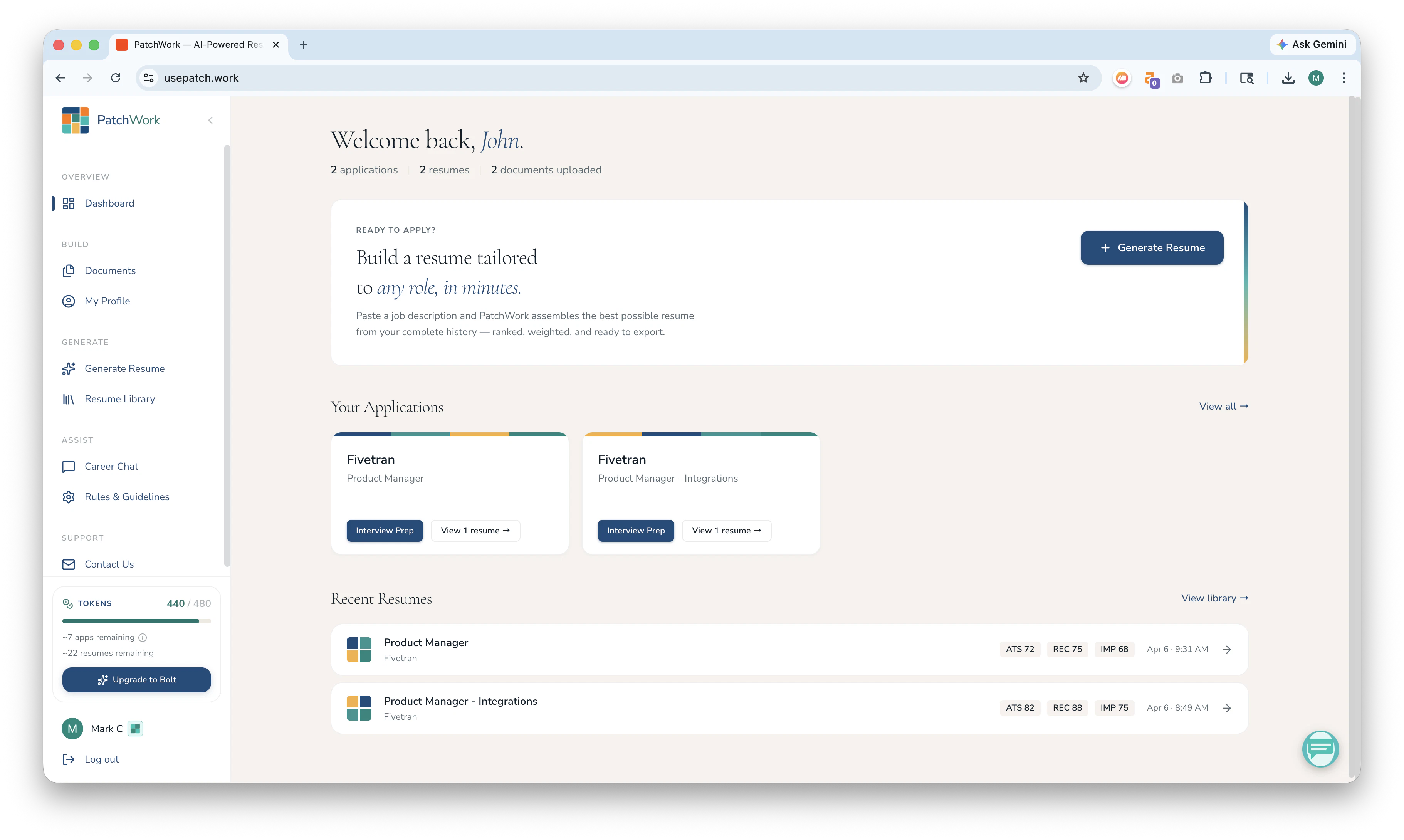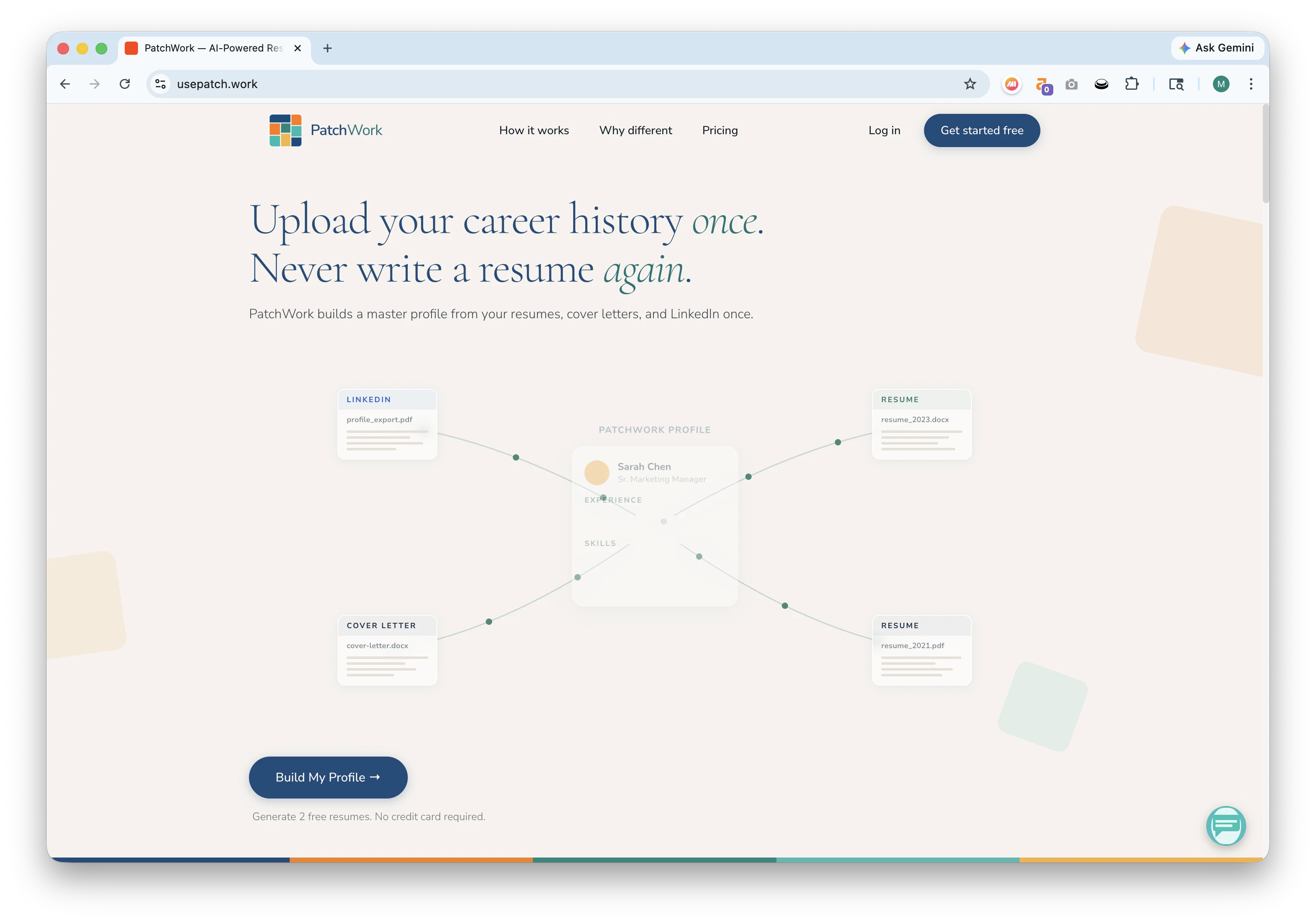Other AI tools adjust the resume you upload to a JD. PatchWork builds your best possible resume for the JD using your entire professional history. Upload your resumes, cover letters, LinkedIn PDF, or any docs that speak to your professional experience once and it builds a master profile of your complete history. After setup, just paste a job description and it writes your best resume for that role and generates a detailed interview prep guide. Stop writing resumes. Start using PatchWork.
