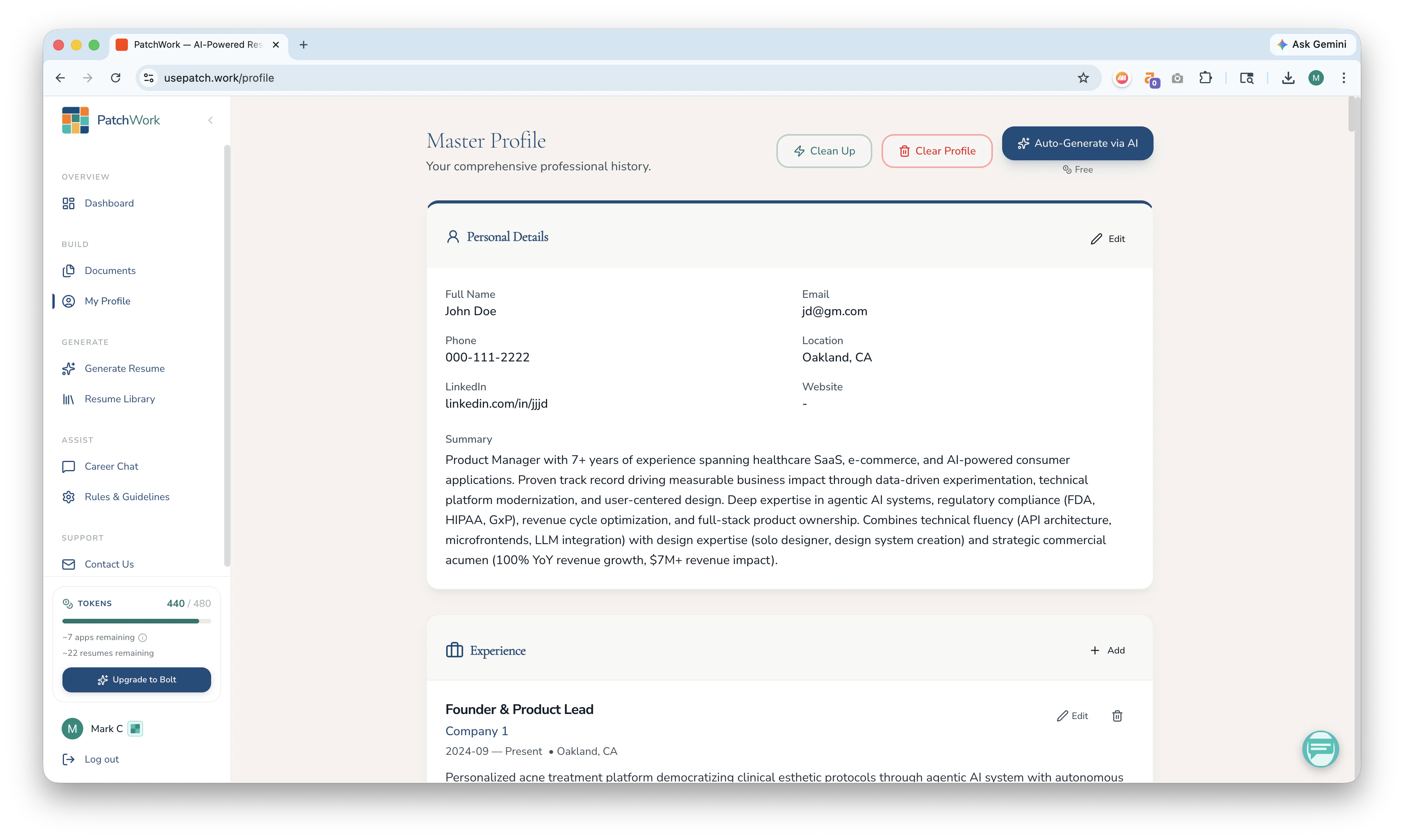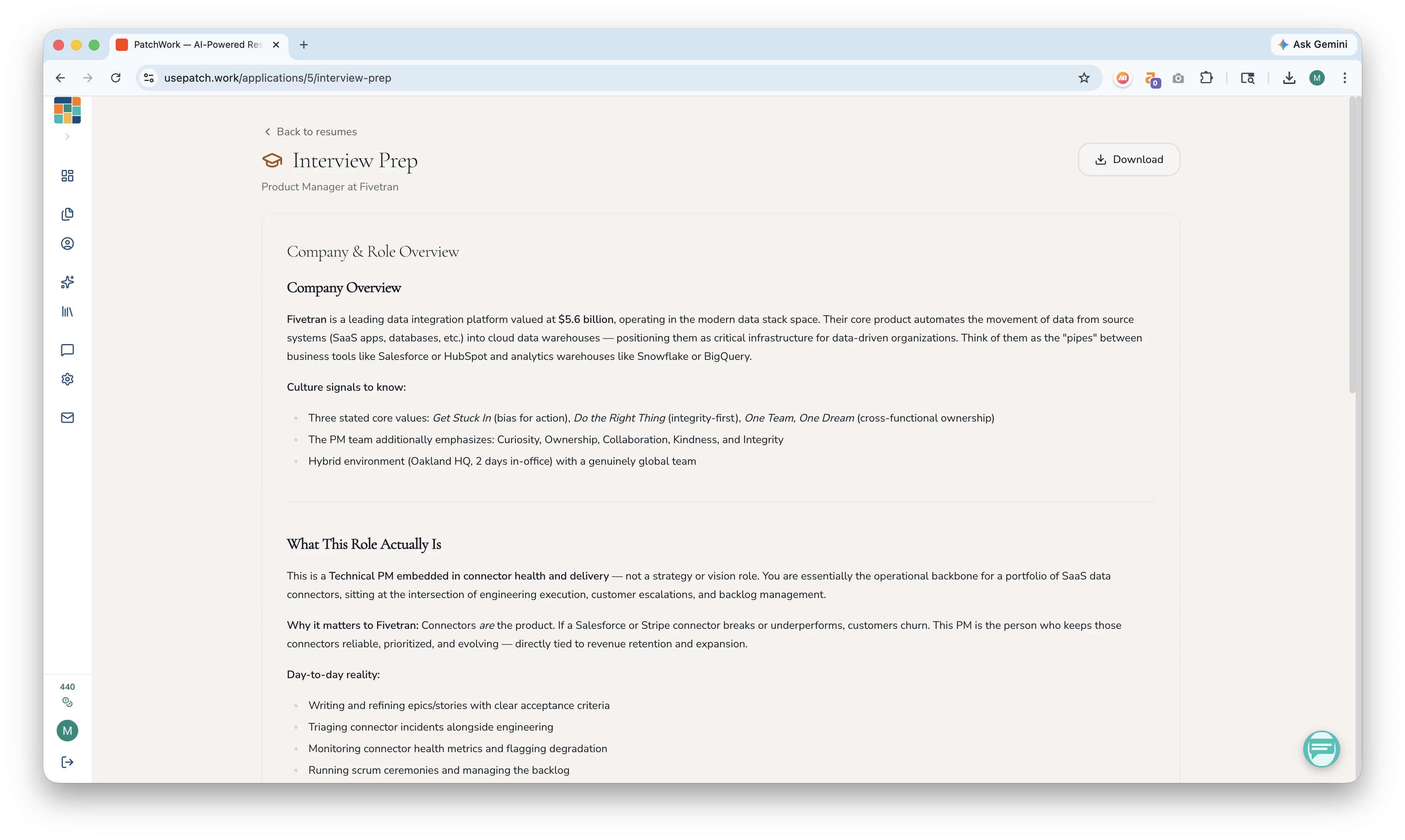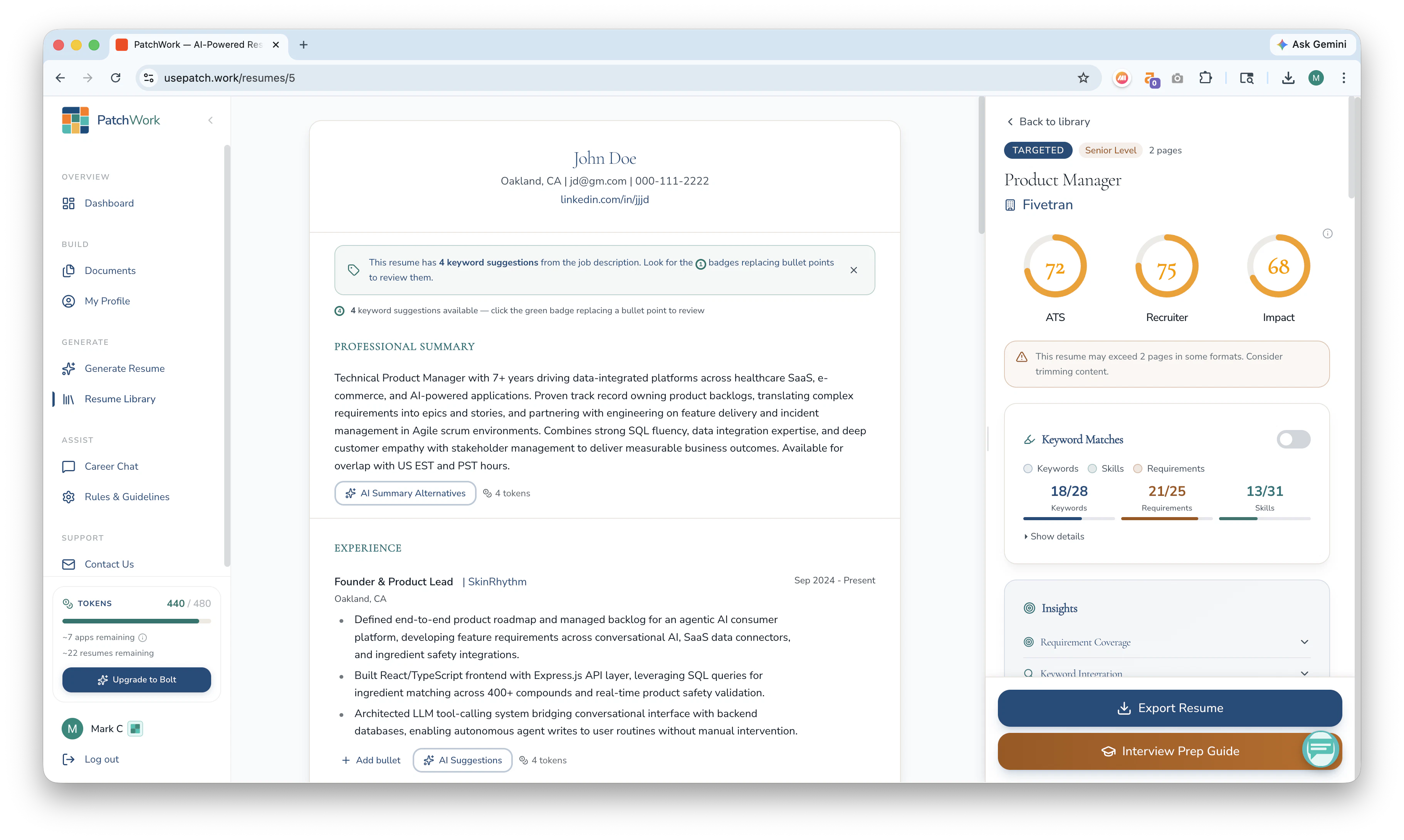 Other AI tools adjust the resume you upload to a JD. PatchWork builds your best possible resume for the JD using your entire professional history. Upload your resumes, cover letters, LinkedIn PDF, or any docs that speak to your professional experience once and it builds a master profile of your complete history. After setup, just paste a job description and it writes your best resume for that role and generates a detailed interview prep guide. Stop writing resumes. Start using PatchWork.