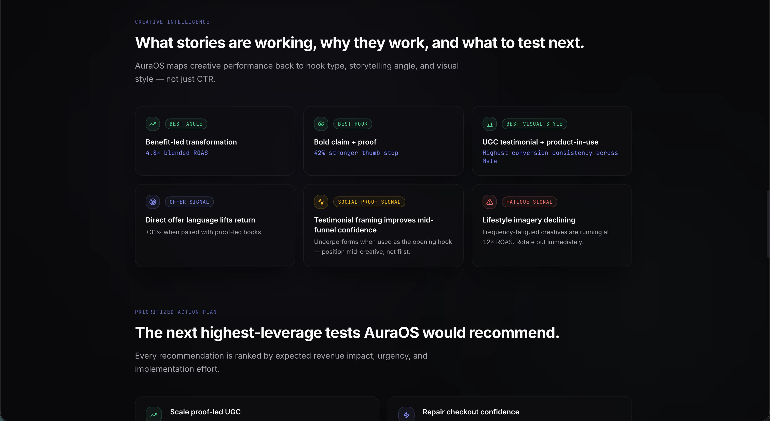 AuraOS is an AI-powered growth decision system connecting campaign, funnel, and creative intelligence into one ranked action plan for DTC brands.