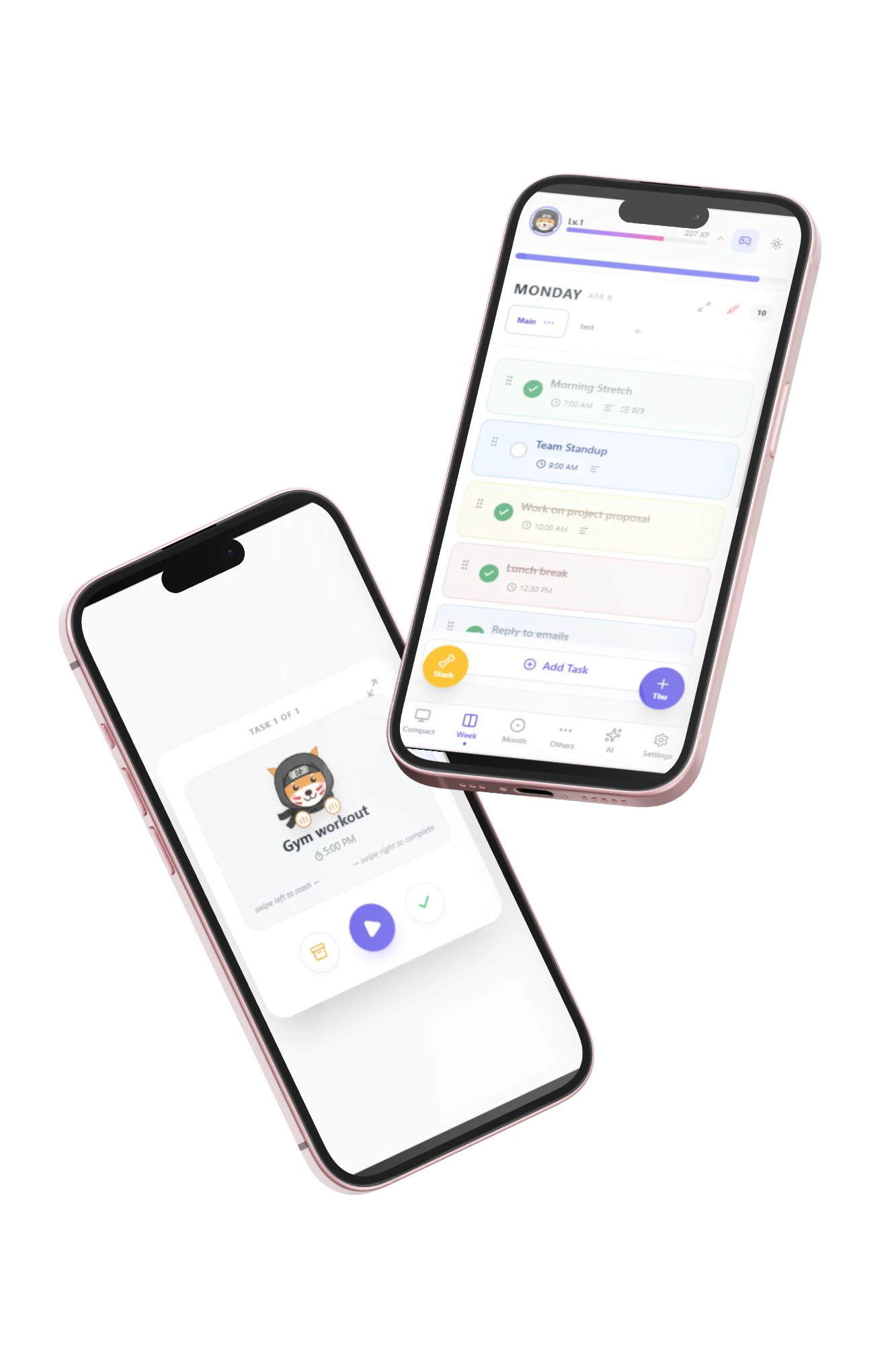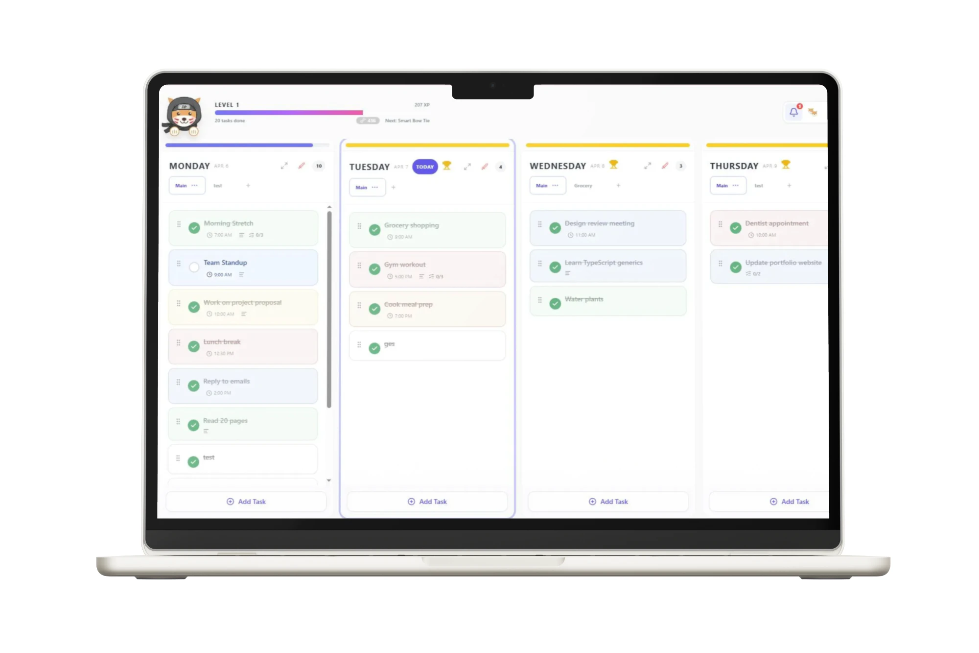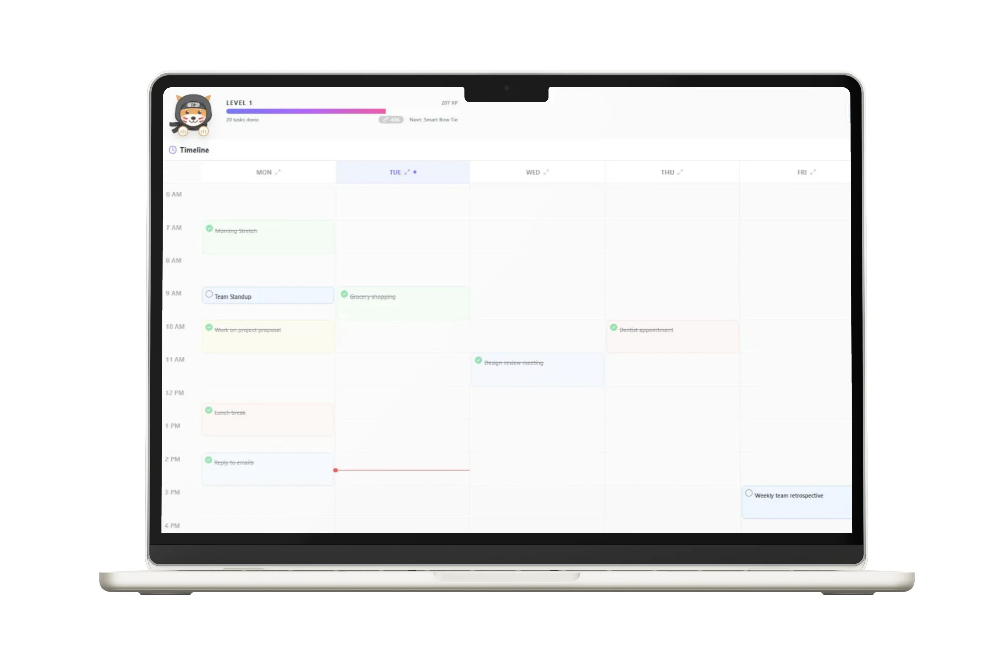 A gamified weekly planner with a virtual Shiba companion