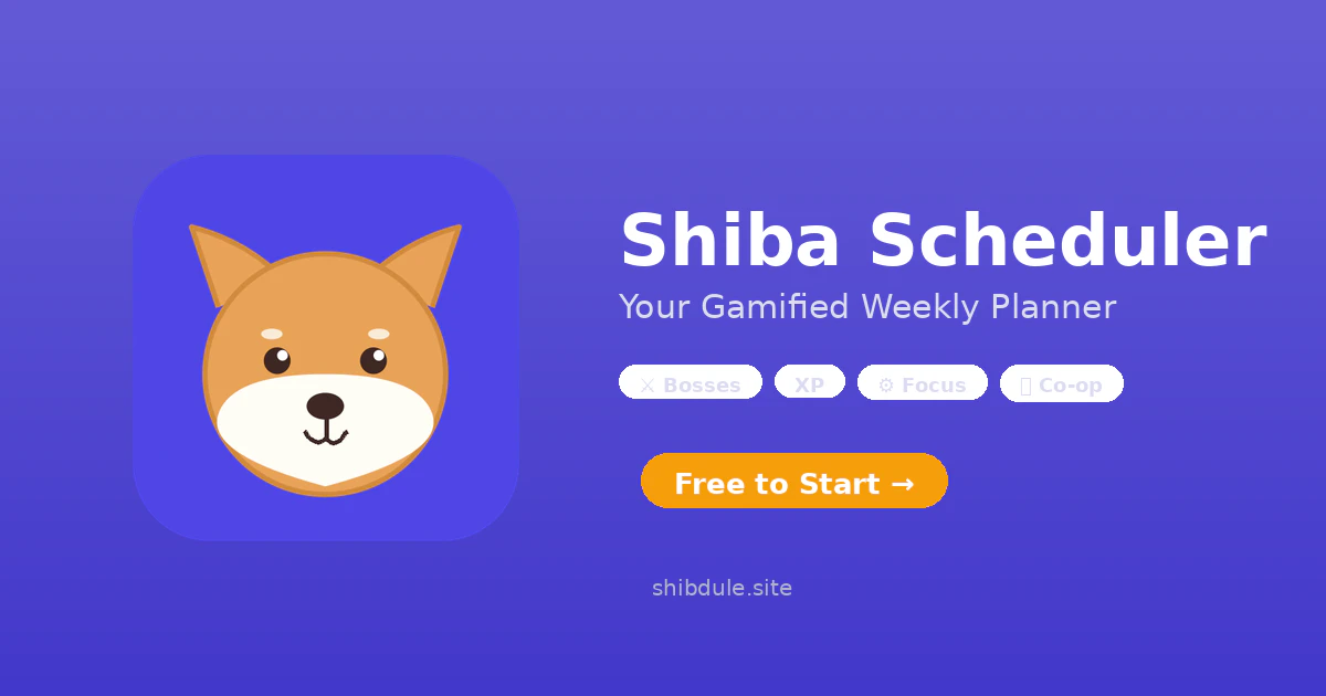 Shiba Scheduler — a gamified weekly planner with a virtual Shiba Inu companion. Plan your week, complete tasks to earn XP and bones, miss deadlines and bosses appear to steal your rewards. Features include focus timers, streak tracking, weekly chest rewards, pack raids with friends, 32 achievements, and a shop full of skins and accessories. Built for students, freelancers, and anyone who wants planning to feel fun. Free to use, no signup required to try.