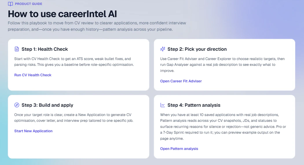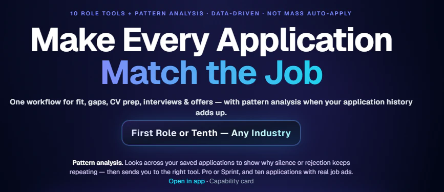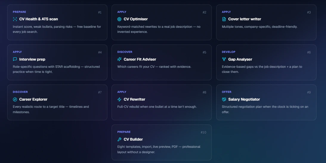 Hi Everyone, I created this because the job hunt was doing my head in — same CV in ten different tools, another “AI coach” spouting advice that could’ve been about anyone. No idea of what was actually going wrong when rejected. Needed that one place to do it all: CV, the actual job ads you’re going for, and a path from “am I even right for this?” through to prep and, if you get there, helping with the offer. Hope you like it. Constructive criticism appreciated.