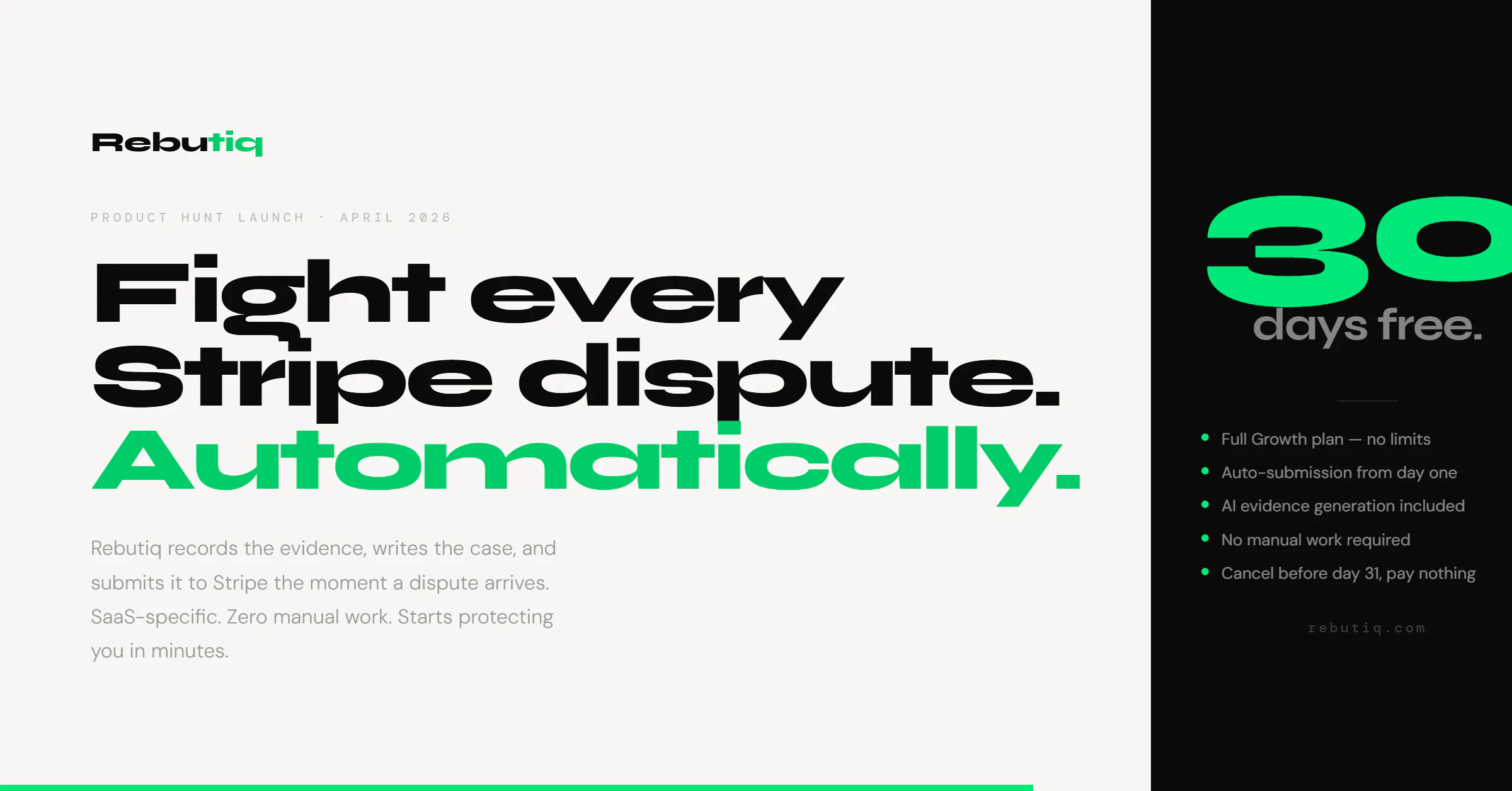 Most SaaS founders lose Stripe disputes not because they're wrong — but because they don't have the right evidence, organized the right way, submitted in time. Rebutiq fixes this completely. Install our SDK and we silently collect evidence from day one — logins, feature usage, TOS acceptance, billing events. When a dispute arrives, we build the case and submit it to Stripe automatically. Zero manual work. Built for SaaS, not Shopify.