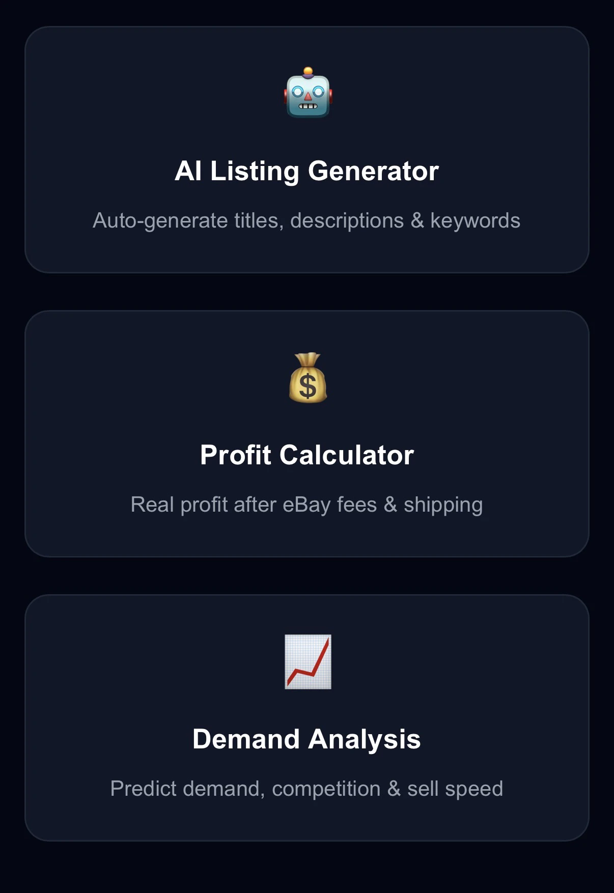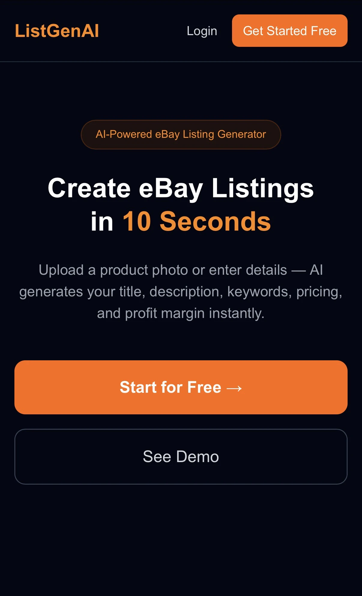 Generated by create next appListGenAI helps eBay sellers create optimized listings instantly. Upload a product photo or enter details — AI generates your title, description, keywords, pricing, and profit margin in seconds. Free plan: 5 listings/month Pro plan: Unlimited listings + demand analysis + photo AI