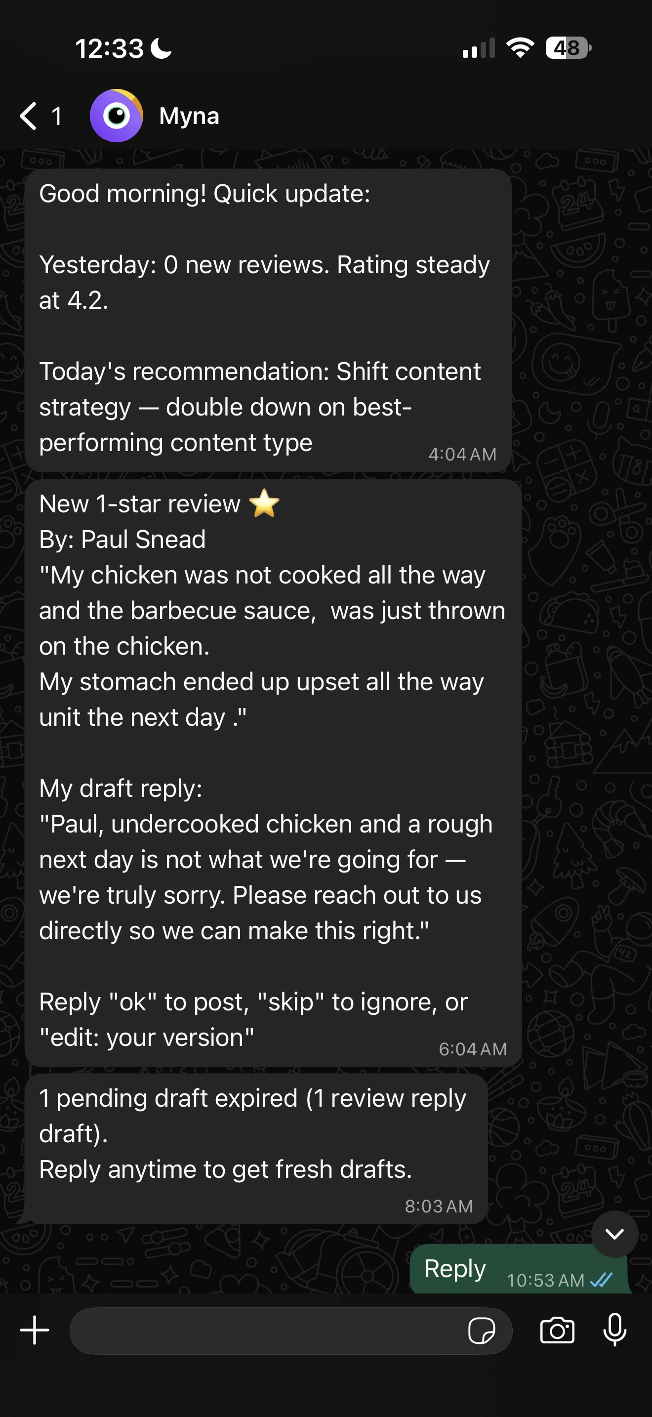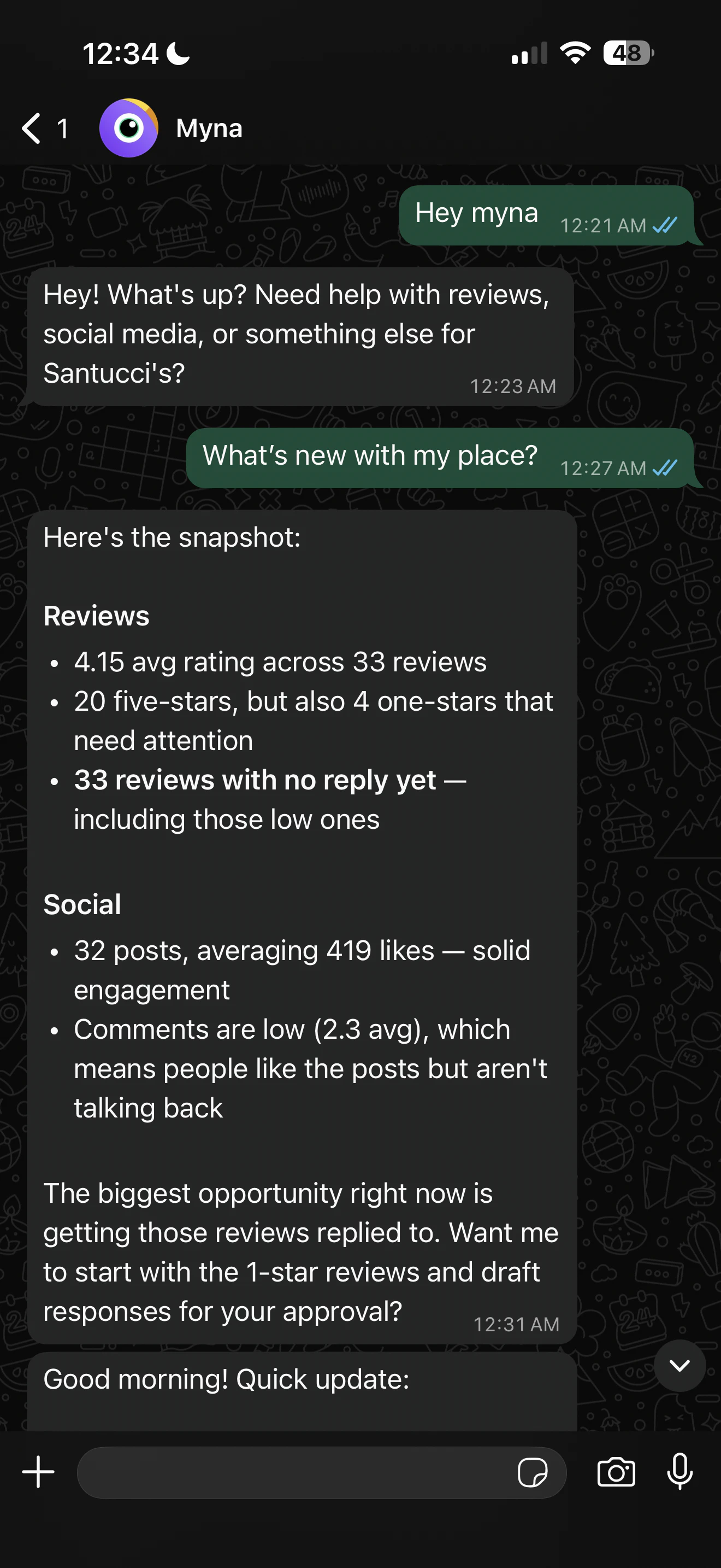 Myna is an AI consultant for local businesses, delivered through WhatsApp, Telegram, Slack, or Teams. Powered by a knowledge graph built from 64,000+ real businesses, it knows what works in your industry before you ask. It drafts review replies in your voice, generates social content, spots competitor moves, and delivers monthly strategy plans. Three modes: autopilot (it acts), copilot (you approve), or manual (just advice). The strategist small businesses could never afford, in a text message.