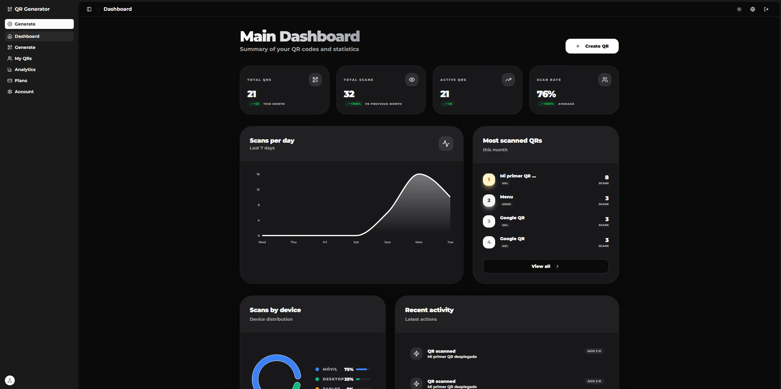 Create free dynamic QR codes: URL, WiFi, vCard, WhatsApp and more. Real-time analytics, full customization and SVG/PNG downloads.