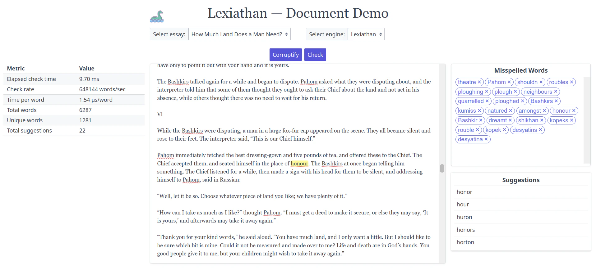 Lexiathan delivers real-time spelling correction in the browser at speeds up to 380× faster than Hunspell, while remaining lightweight, deterministic, and highly accurate, even on severely misspelled words.