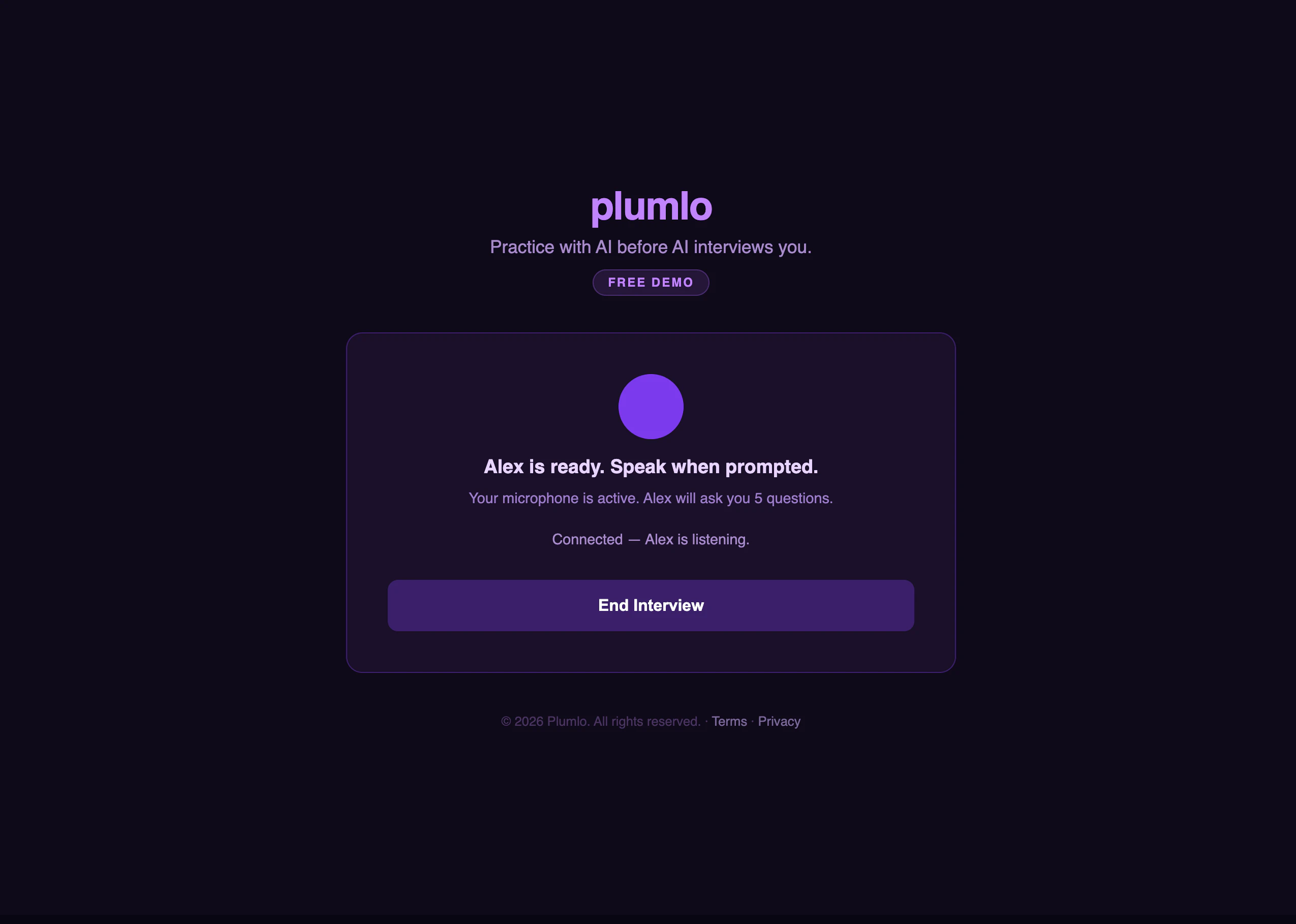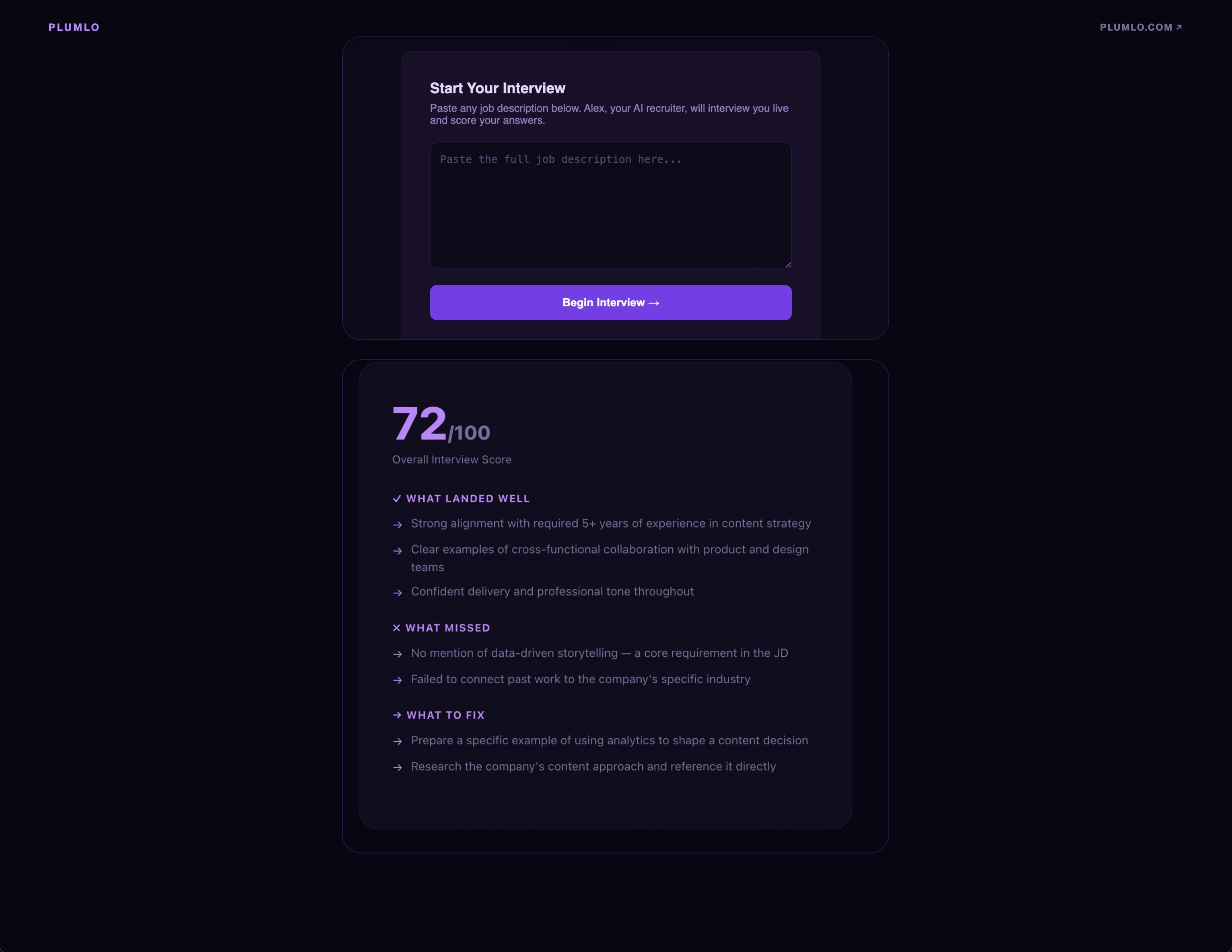 Most interview prep tells you what to say. Plumlo puts you in the actual conversation — live audio, real questions built from your job description — and scores your answers against the role when it's done.