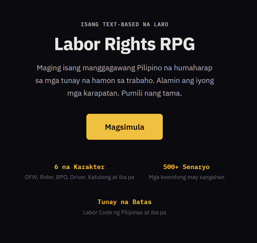 LaborQuest is a free text-based RPG where Filipino workers learn their labor rights through real workplace scenarios. Pick a character — OFW, delivery rider, BPO worker, kasambahay, construction worker, or family driver. Face realistic situations: illegal deductions, contract scams, unpaid overtime. Every choice has consequences. 500+ scenarios based on the actual Labor Code of the Philippines. No ads. No cost. English and Filipino. Built by a solo developer.