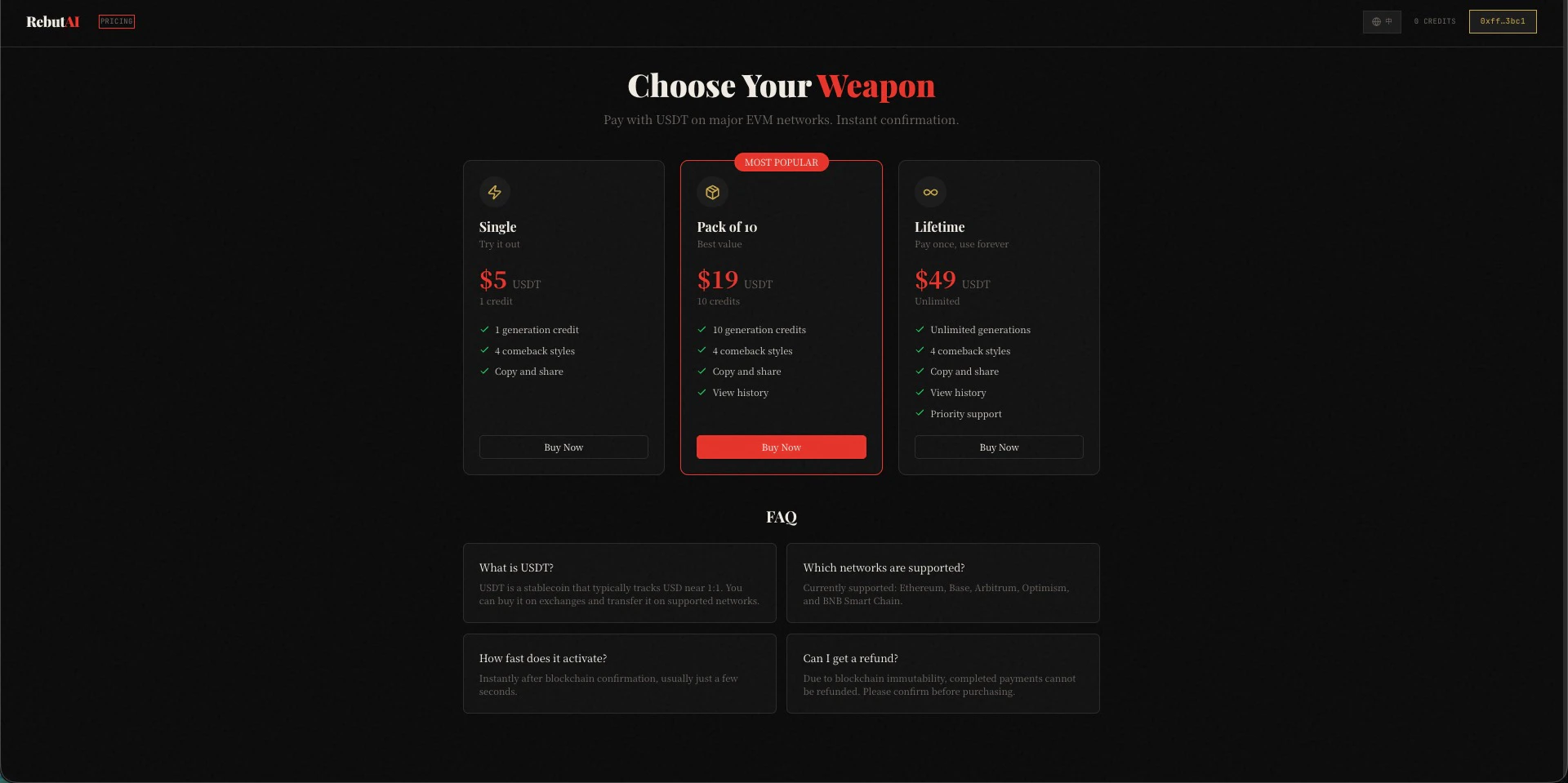 AI-powered rebuttals. Wallet login. No subscriptions.