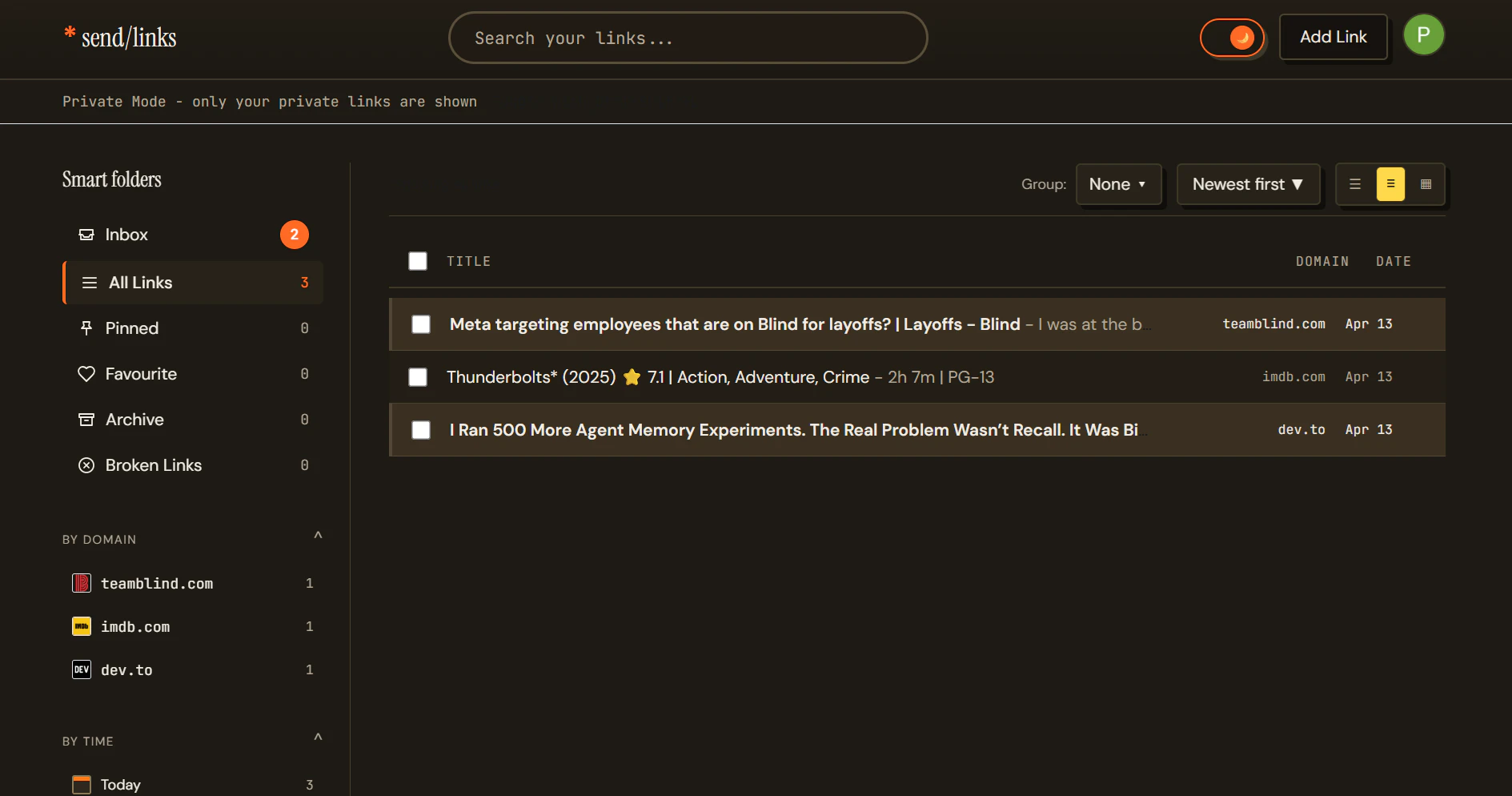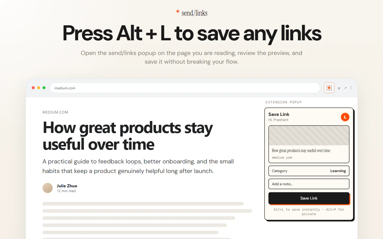 Save links from your browser. Organized automatically. Find anything in seconds. Links get lost. Bookmarks pile up and never get revisited. Tabs stay open for weeks because you don't know where else to put them. sendlinks fixes that. Press Alt+L on any page - your link is saved, titled, and categorized automatically. No manual tagging. No folders to manage. Save privately with Alt+P. PIN-protected, invisible to everyone. Free forever. No credit card needed.