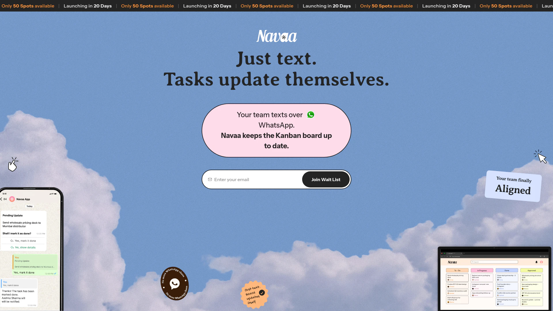 Navaa is a team operating system where your team texts on WhatsApp and the Kanban board and task list updates itself. Built for 2–8 person teams and the freelancers they work. No setup. No new habits. No blank slate. Built after real founder interviews. Waitlist open now - 50 founding spots only.